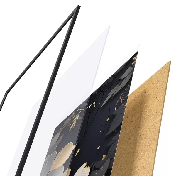 De poster bestaat uit een frame, plexiglas, geprinte afbeelding en spaanplaat achterkant. De poster kan meteen aan de muur worden gehangen dankzij de bevestigingen op de achterkant.