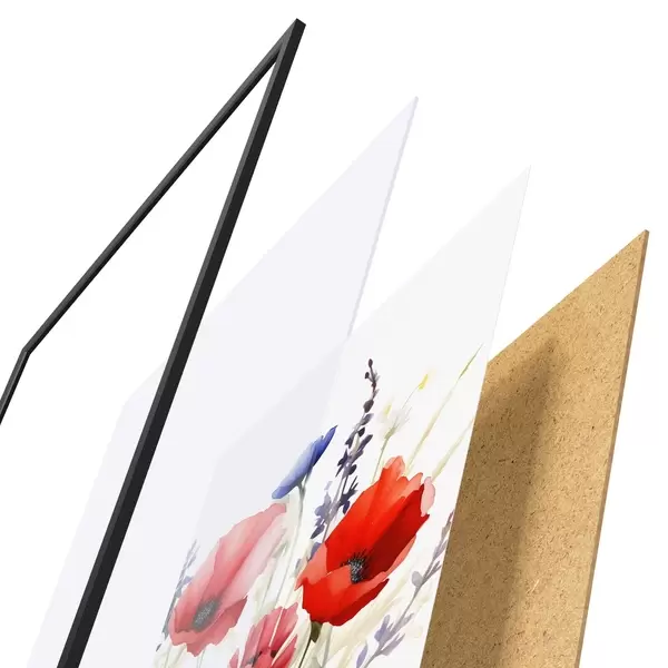 De poster bestaat uit een frame, plexiglas, geprinte afbeelding en spaanplaat achterkant. De poster kan meteen aan de muur worden gehangen dankzij de bevestigingen op de achterkant.