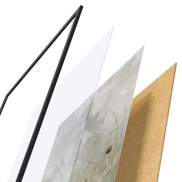 De poster bestaat uit een frame, plexiglas, geprinte afbeelding en spaanplaat achterkant. De poster kan meteen aan de muur worden gehangen dankzij de bevestigingen op de achterkant.