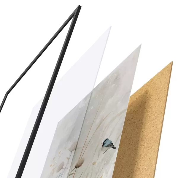 De poster bestaat uit een frame, plexiglas, geprinte afbeelding en spaanplaat achterkant. De poster kan meteen aan de muur worden gehangen dankzij de bevestigingen op de achterkant.