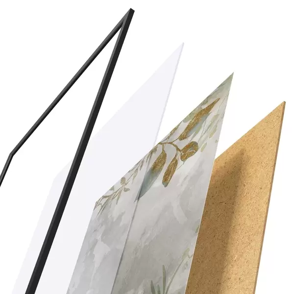 De poster bestaat uit een frame, plexiglas, geprinte afbeelding en spaanplaat achterkant. De poster kan meteen aan de muur worden gehangen dankzij de bevestigingen op de achterkant.