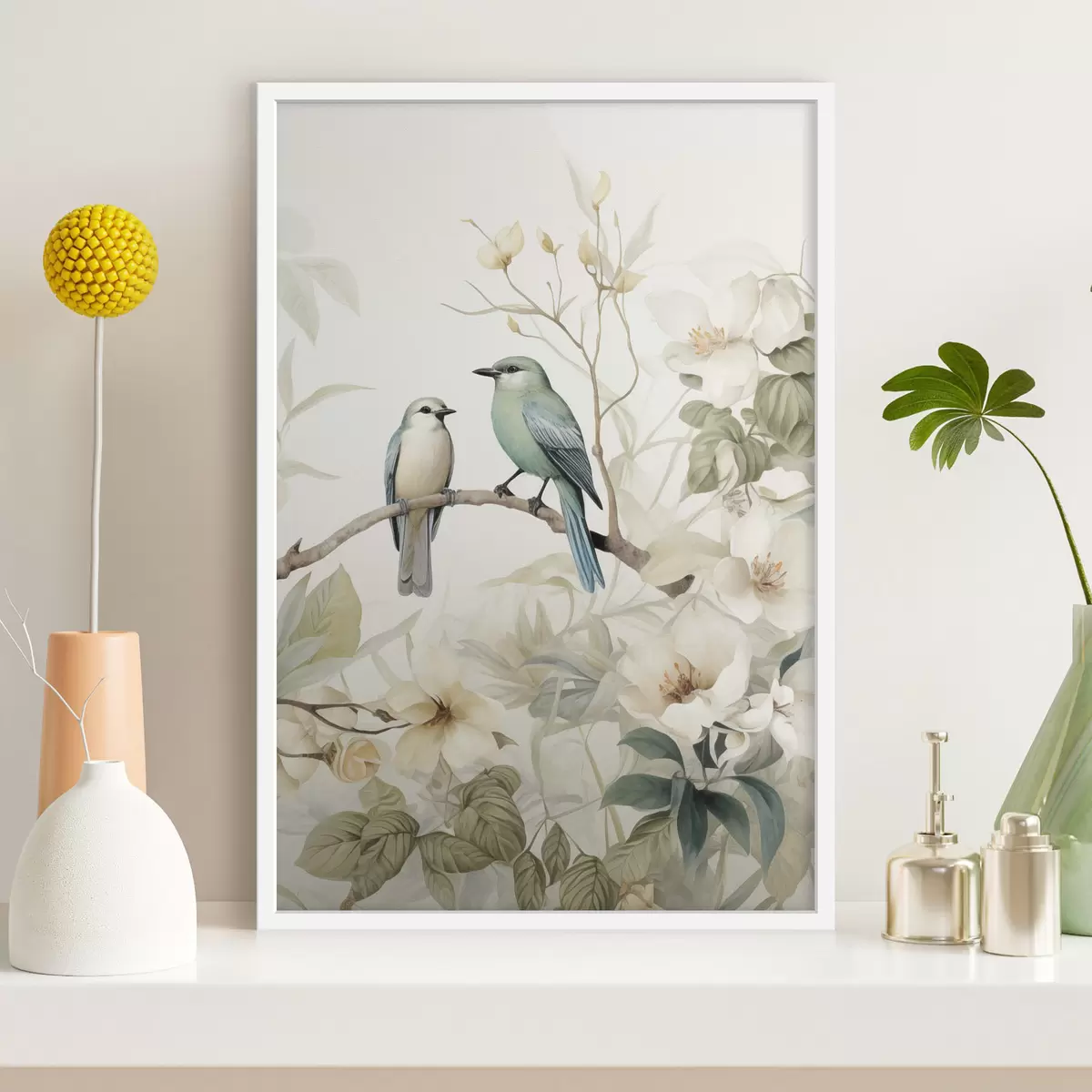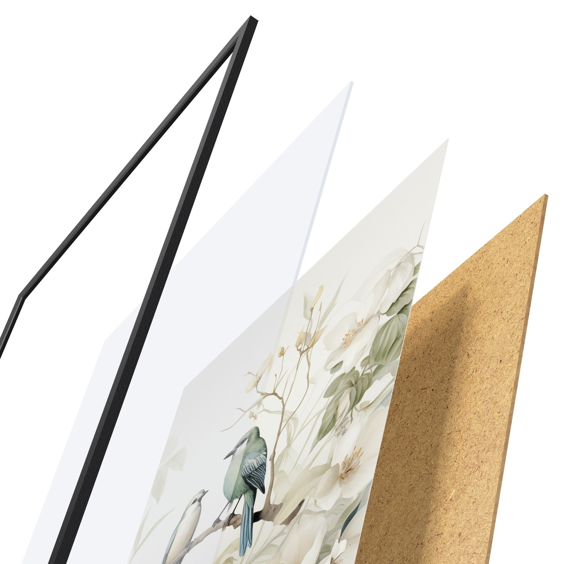 De poster bestaat uit een frame, plexiglas, geprinte afbeelding en spaanplaat achterkant. De poster kan meteen aan de muur worden gehangen dankzij de bevestigingen op de achterkant.