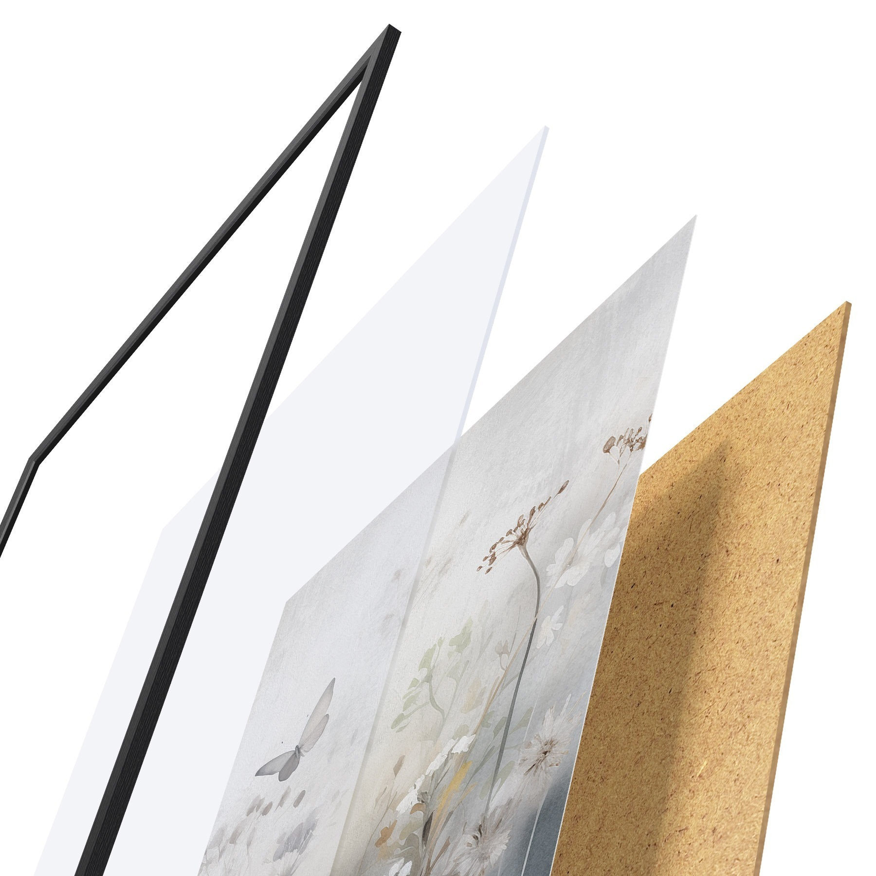 De poster bestaat uit een frame, plexiglas, geprinte afbeelding en spaanplaat achterkant. De poster kan meteen aan de muur worden gehangen dankzij de bevestigingen op de achterkant.