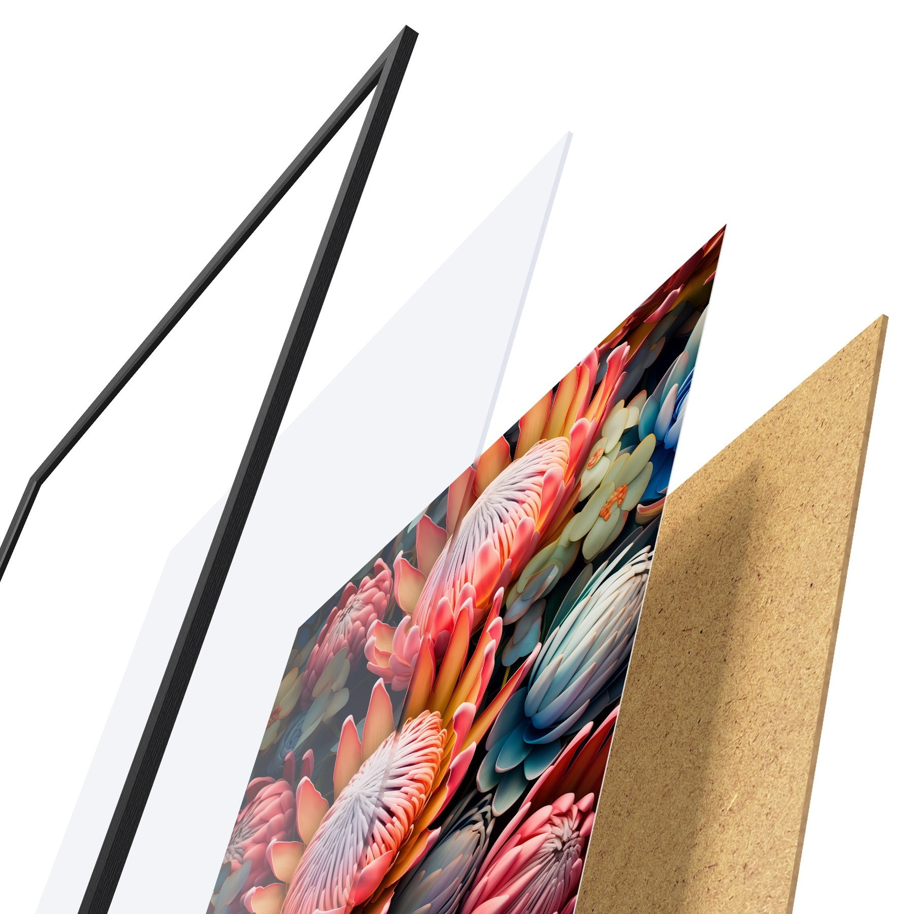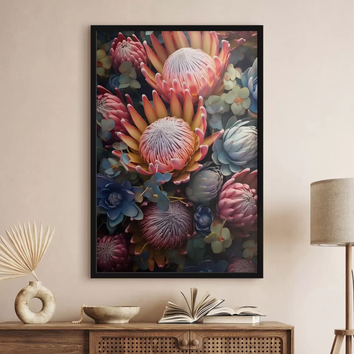 Poster Samenstelling van protea's, eucalyptus en vetplanten in een fotorealistische digitale kunststijl f46925