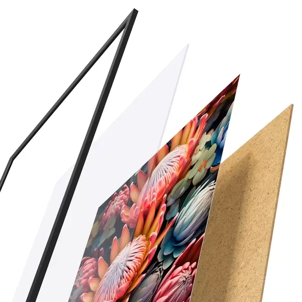De poster bestaat uit een frame, plexiglas, geprinte afbeelding en spaanplaat achterkant. De poster kan meteen aan de muur worden gehangen dankzij de bevestigingen op de achterkant.