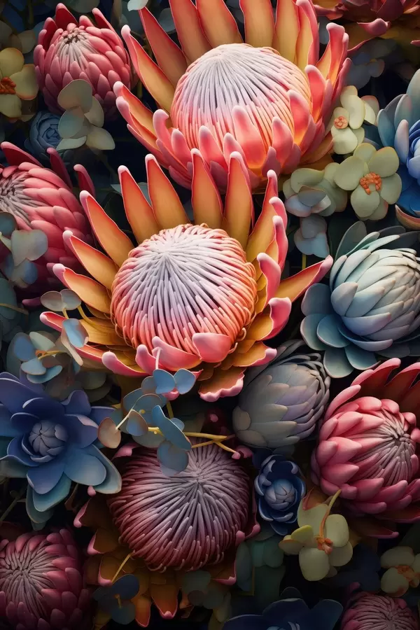 Poster Samenstelling van protea's, eucalyptus en vetplanten in een fotorealistische digitale kunststijl f46925
