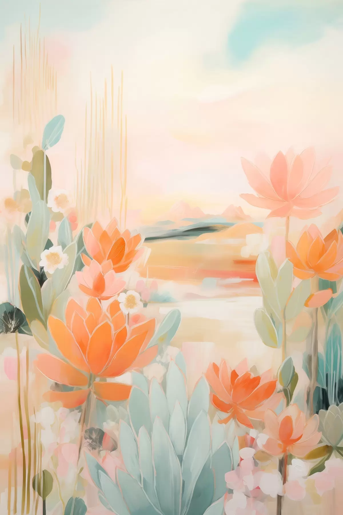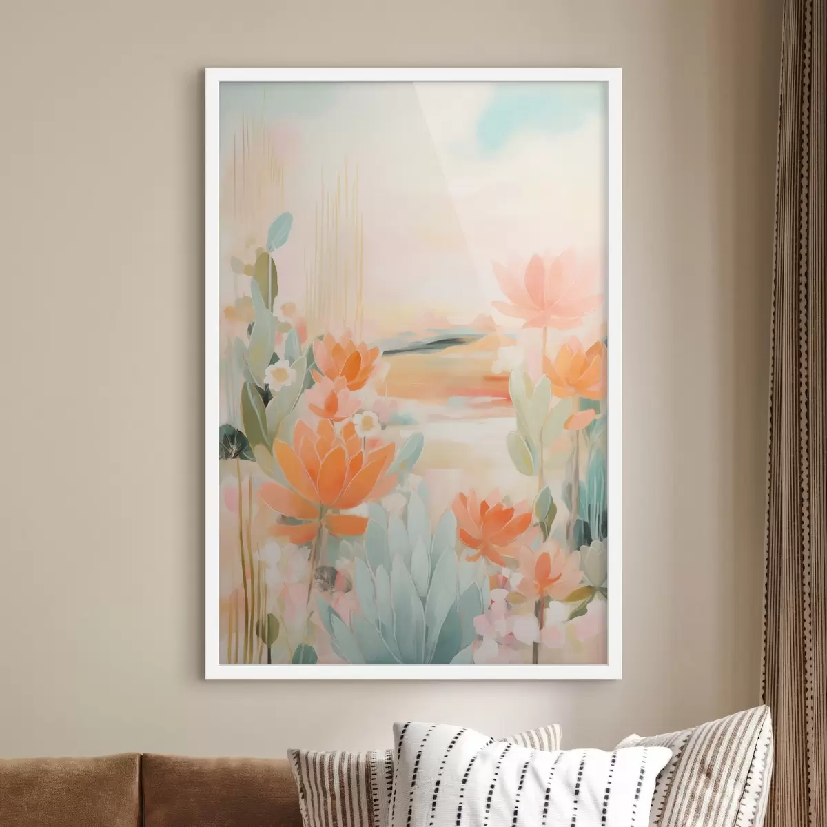 Poster Bloemenlandschap in roze en blauwe tinten in een eigentijdse schilderstijl N° f46931