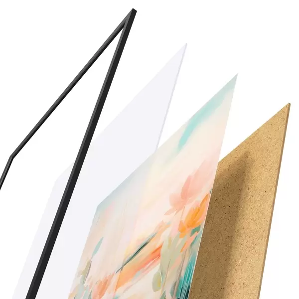 De poster bestaat uit een frame, plexiglas, geprinte afbeelding en spaanplaat achterkant. De poster kan meteen aan de muur worden gehangen dankzij de bevestigingen op de achterkant.