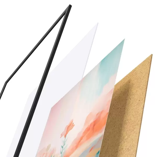 De poster bestaat uit een frame, plexiglas, geprinte afbeelding en spaanplaat achterkant. De poster kan meteen aan de muur worden gehangen dankzij de bevestigingen op de achterkant.