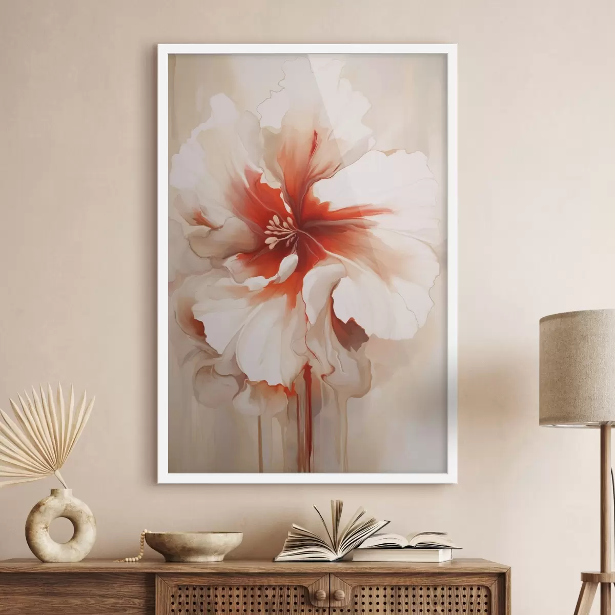 Poster Close-up van een witte en rode bloem met semi-transparante bloemblaadjes en vloeiende verfdruppels N° f46941