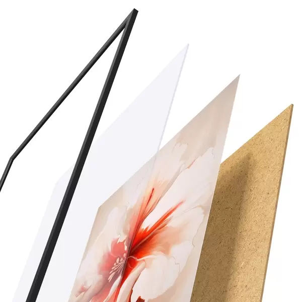 De poster bestaat uit een frame, plexiglas, geprinte afbeelding en spaanplaat achterkant. De poster kan meteen aan de muur worden gehangen dankzij de bevestigingen op de achterkant.