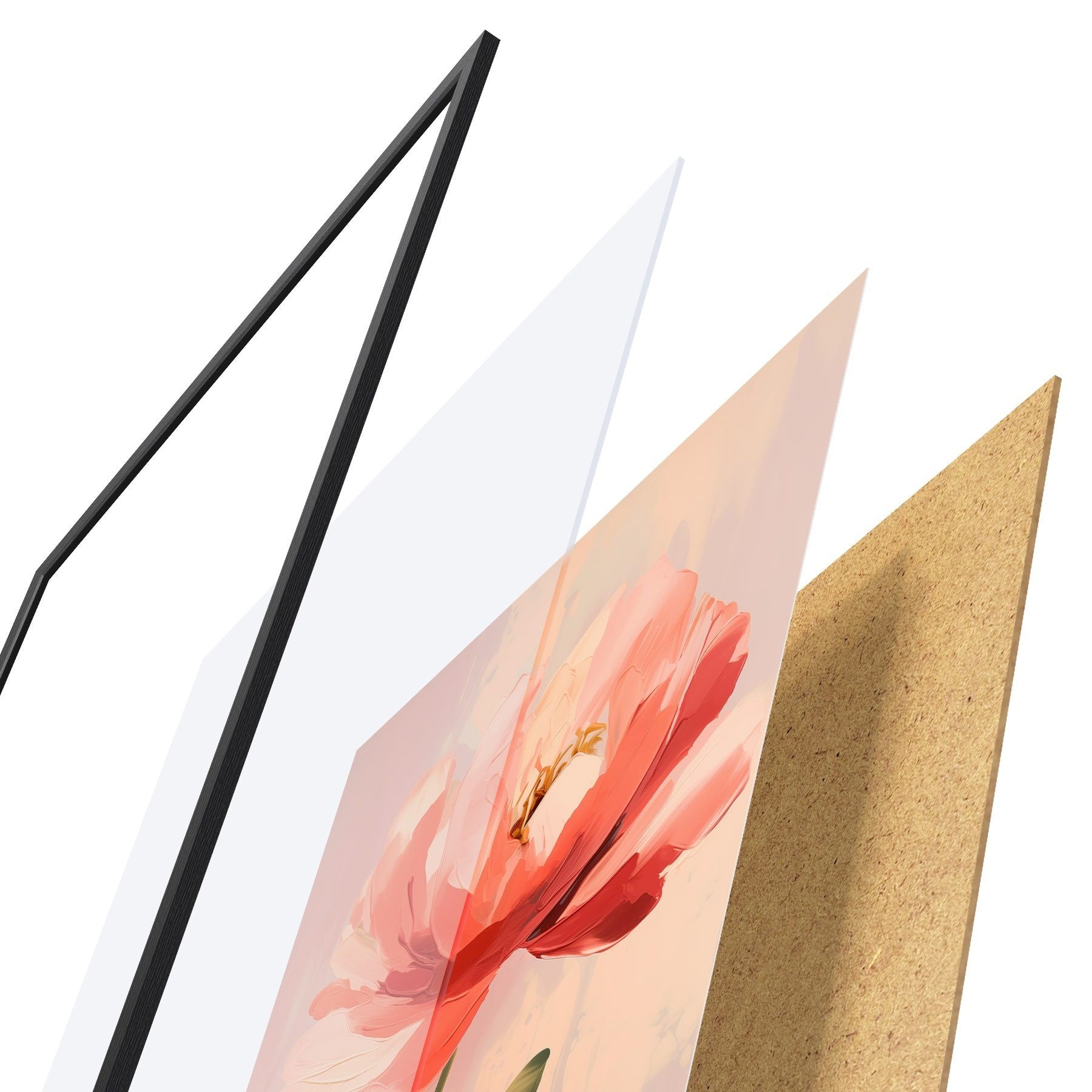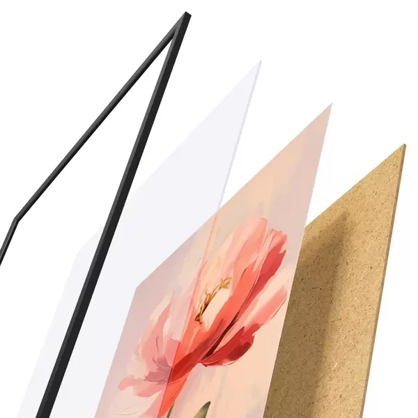 De poster bestaat uit een frame, plexiglas, geprinte afbeelding en spaanplaat achterkant. De poster kan meteen aan de muur worden gehangen dankzij de bevestigingen op de achterkant.