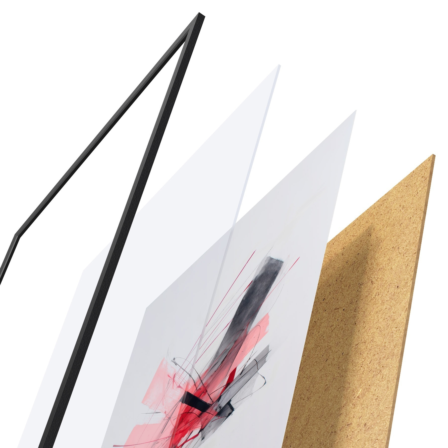 De poster bestaat uit een frame, plexiglas, geprinte afbeelding en spaanplaat achterkant. De poster kan meteen aan de muur worden gehangen dankzij de bevestigingen op de achterkant.