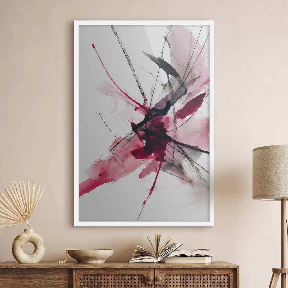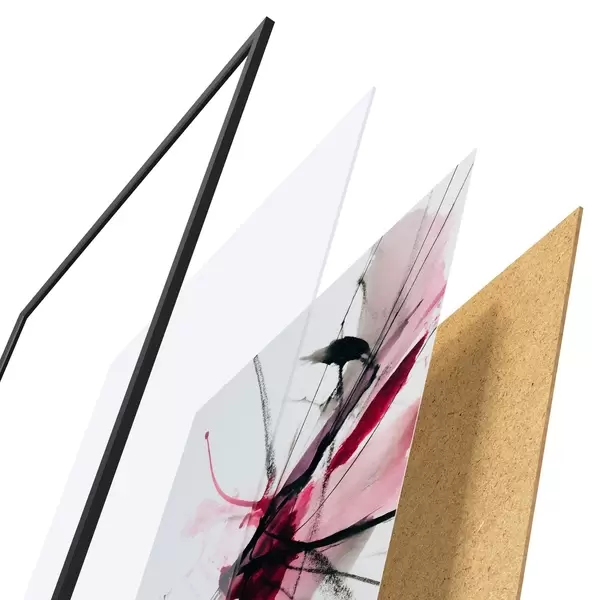 De poster bestaat uit een frame, plexiglas, geprinte afbeelding en spaanplaat achterkant. De poster kan meteen aan de muur worden gehangen dankzij de bevestigingen op de achterkant.