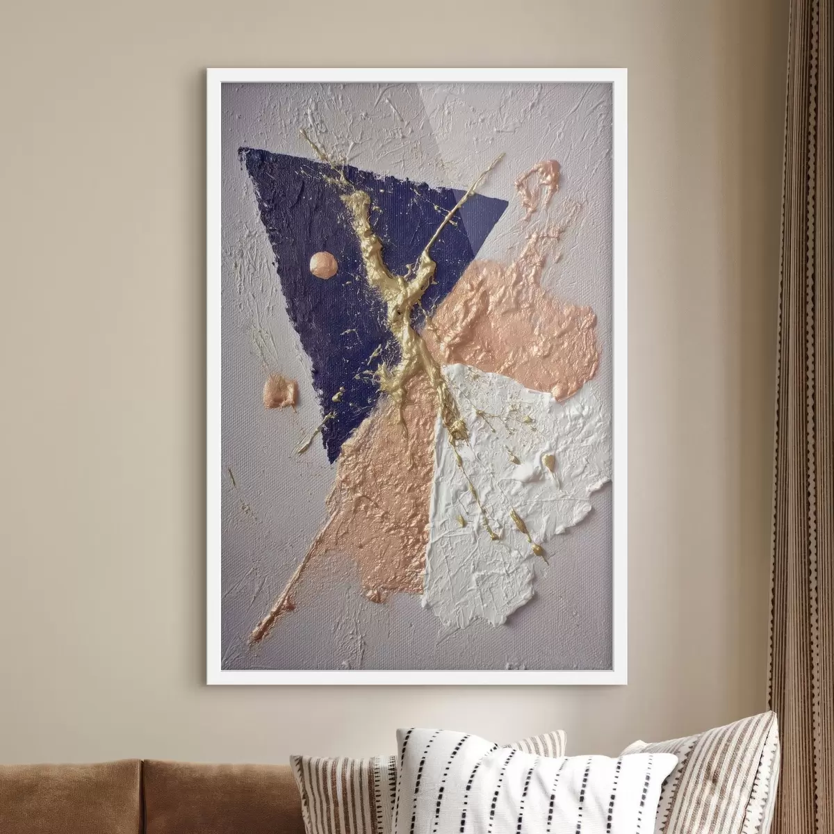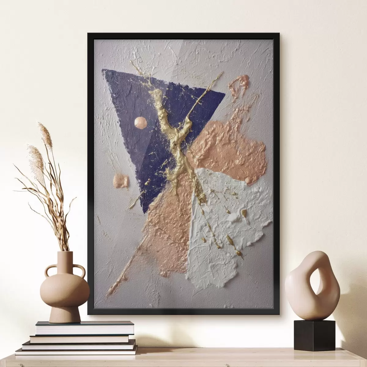 Poster Abstracte compositie met een donkerblauwe driehoek en reliëfachtige penseelstreken in olieverfstijl N° f46953