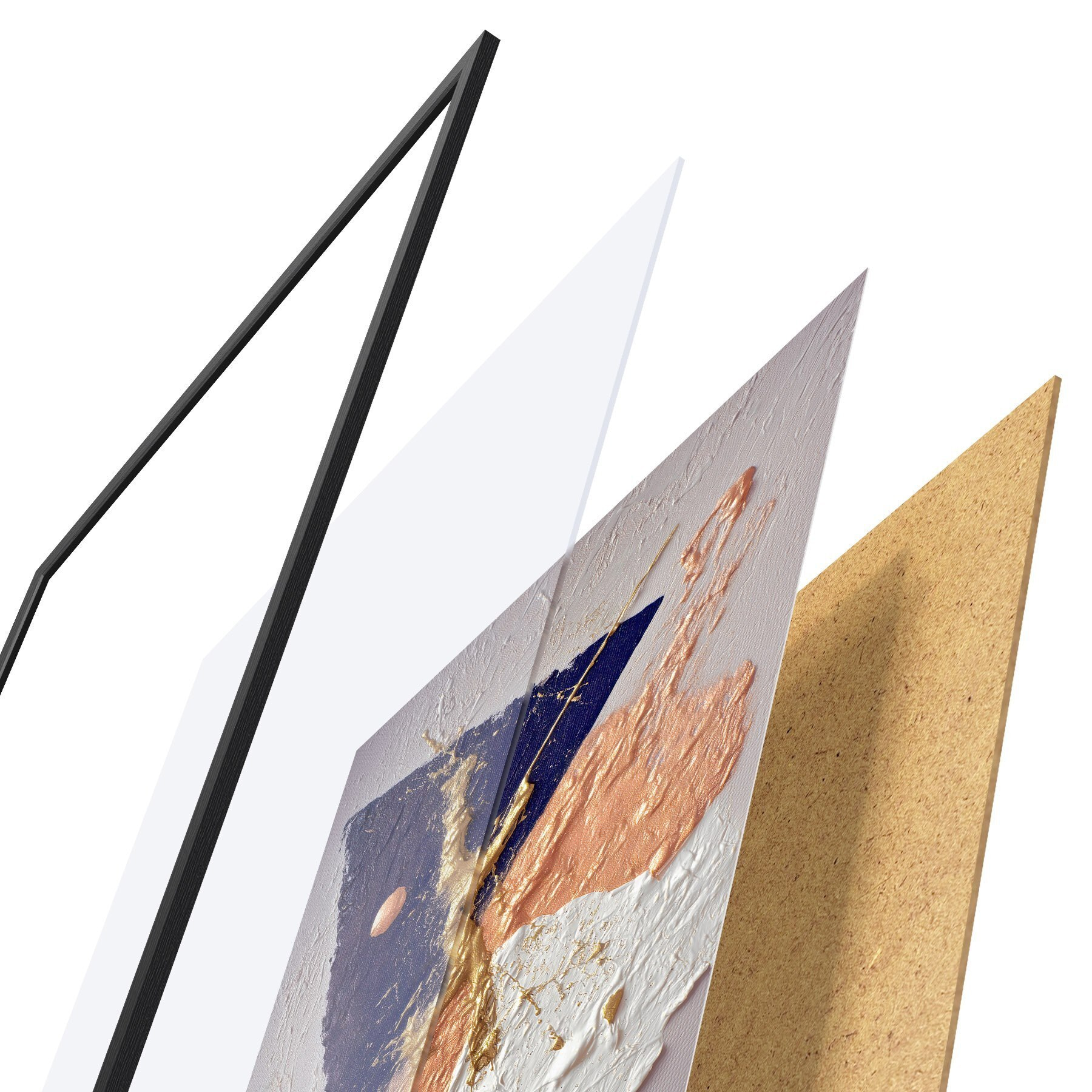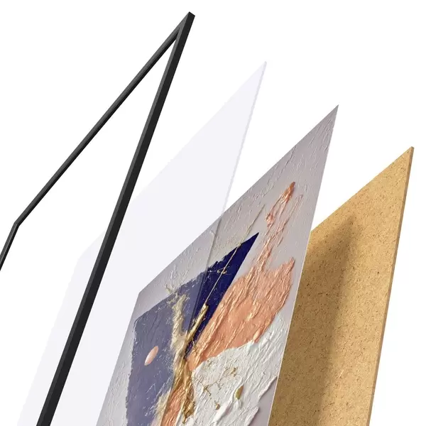 De poster bestaat uit een frame, plexiglas, geprinte afbeelding en spaanplaat achterkant. De poster kan meteen aan de muur worden gehangen dankzij de bevestigingen op de achterkant.