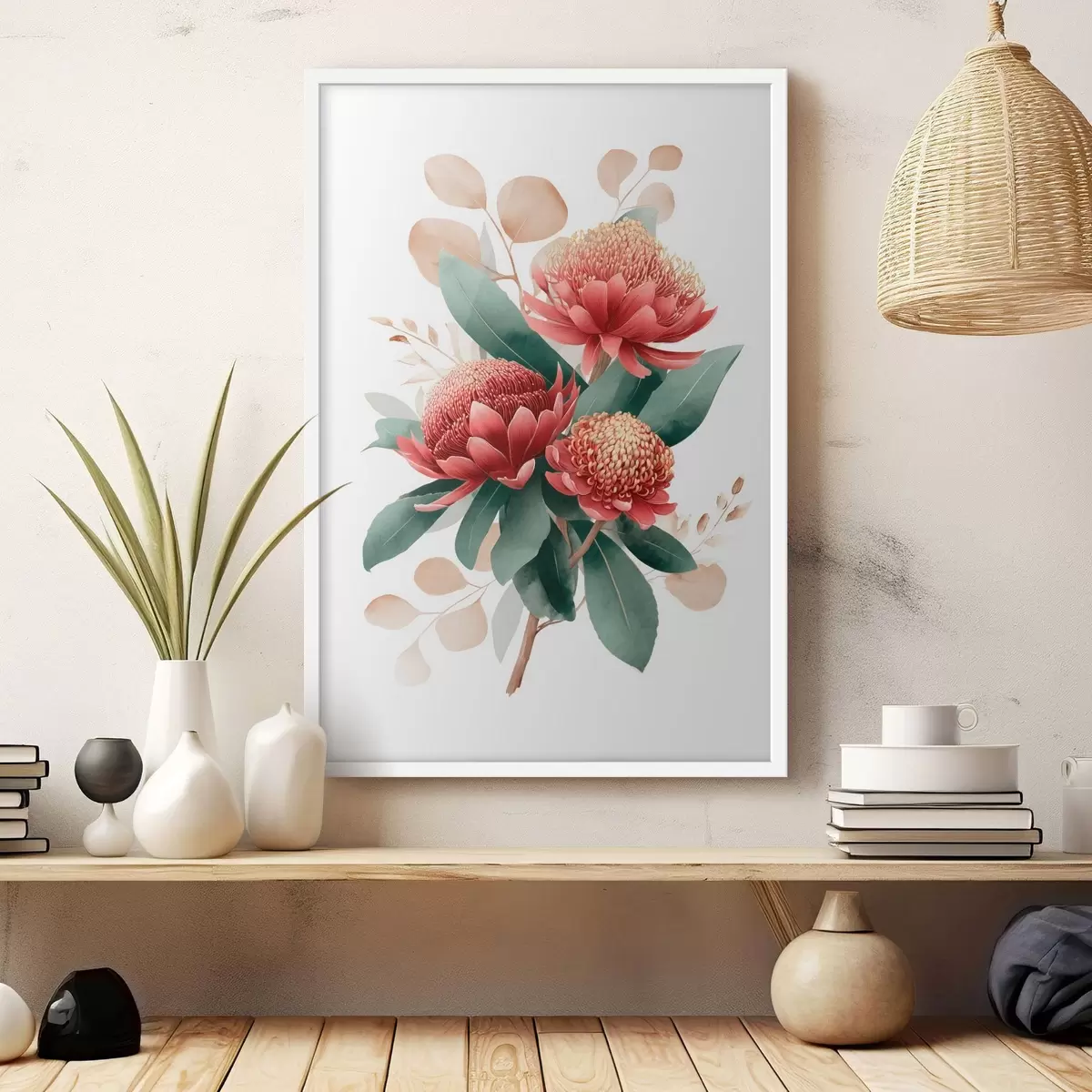 Poster Expressief boeket van protea's en decoratief blad in moderne kunstillustratiestijl N° f46954