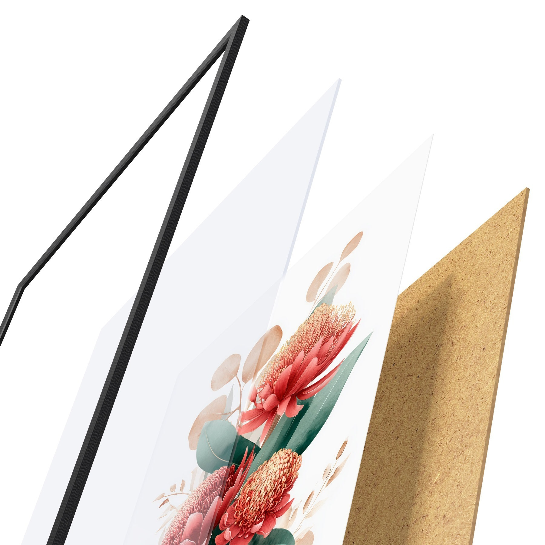 De poster bestaat uit een frame, plexiglas, geprinte afbeelding en spaanplaat achterkant. De poster kan meteen aan de muur worden gehangen dankzij de bevestigingen op de achterkant.