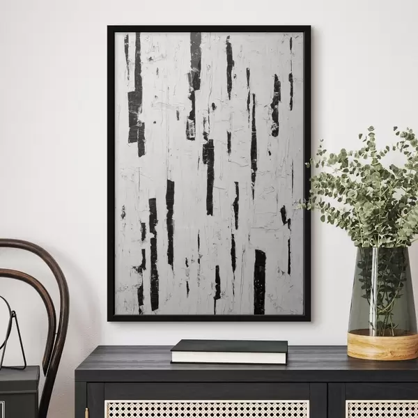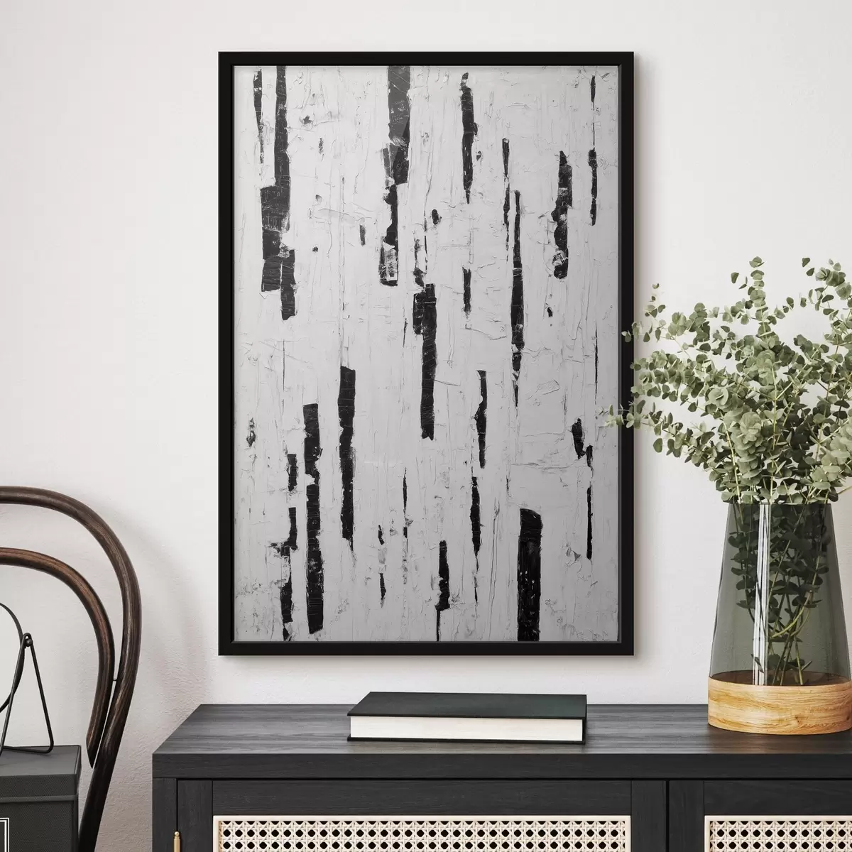 Poster Abstracte compositie met zwarte verticale penseelstreken op een witte achtergrond in olieverfstijl f46956