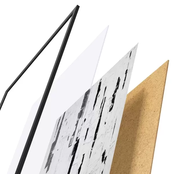 De poster bestaat uit een frame, plexiglas, geprinte afbeelding en spaanplaat achterkant. De poster kan meteen aan de muur worden gehangen dankzij de bevestigingen op de achterkant.