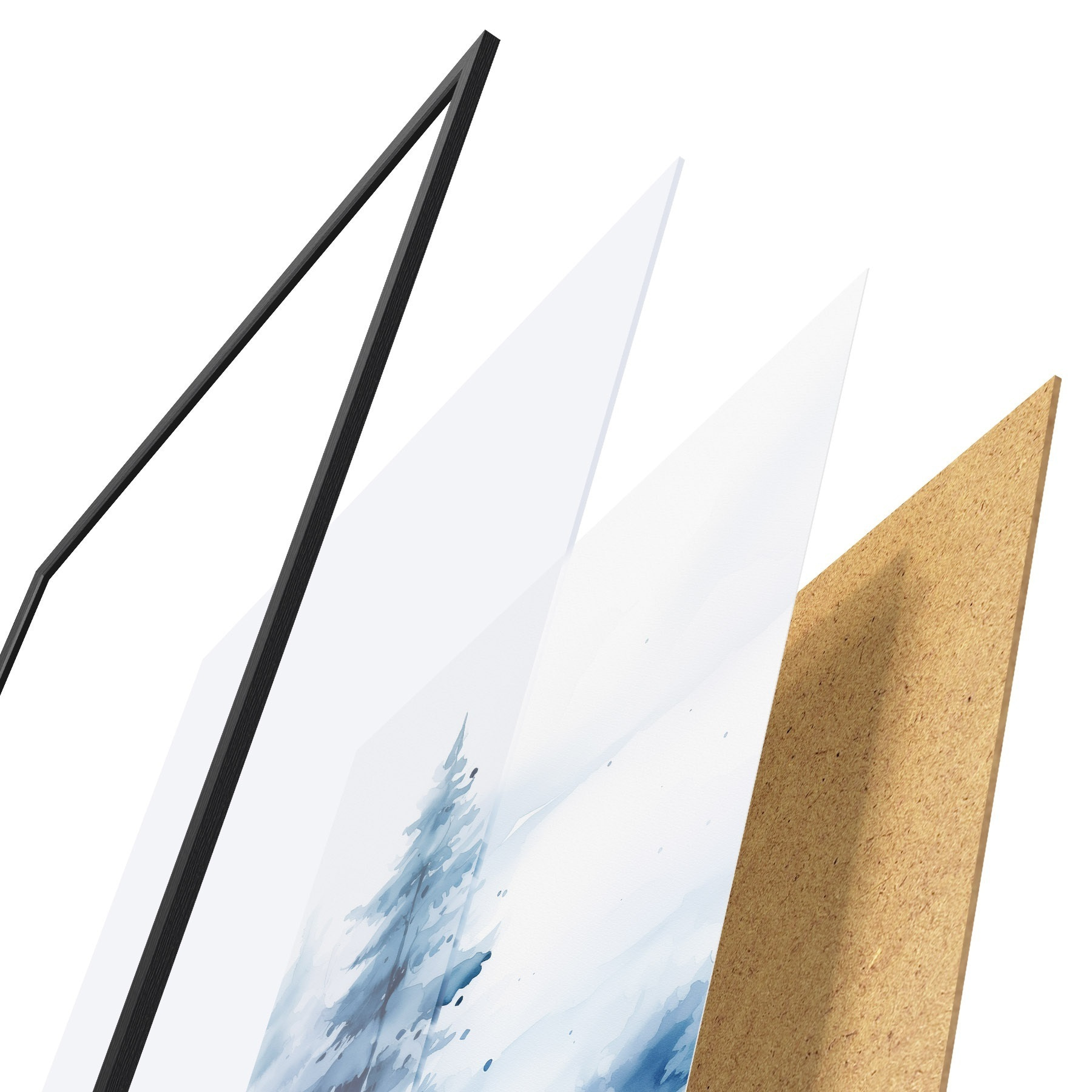 De poster bestaat uit een frame, plexiglas, geprinte afbeelding en spaanplaat achterkant. De poster kan meteen aan de muur worden gehangen dankzij de bevestigingen op de achterkant.