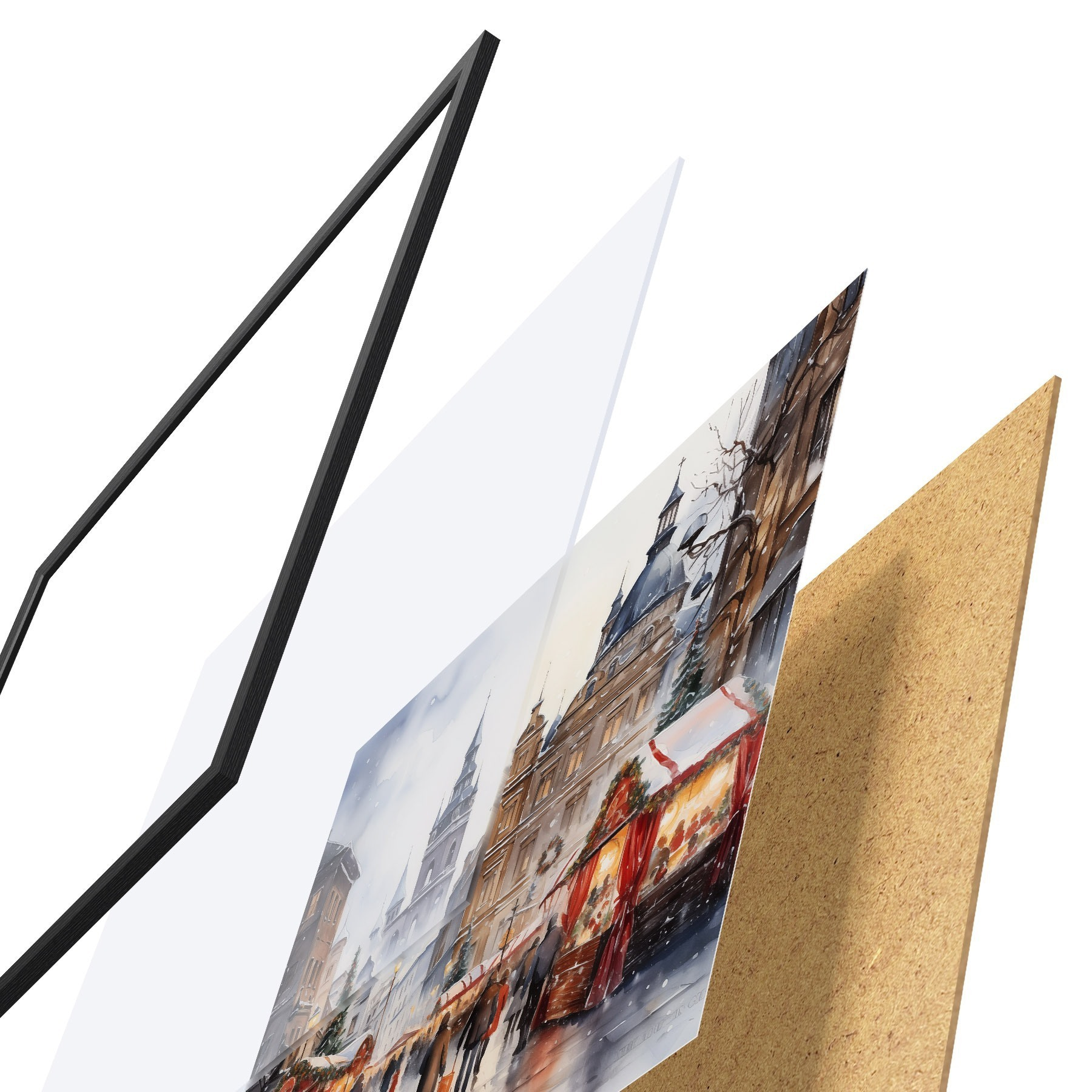 De poster bestaat uit een frame, plexiglas, geprinte afbeelding en spaanplaat achterkant. De poster kan meteen aan de muur worden gehangen dankzij de bevestigingen op de achterkant.