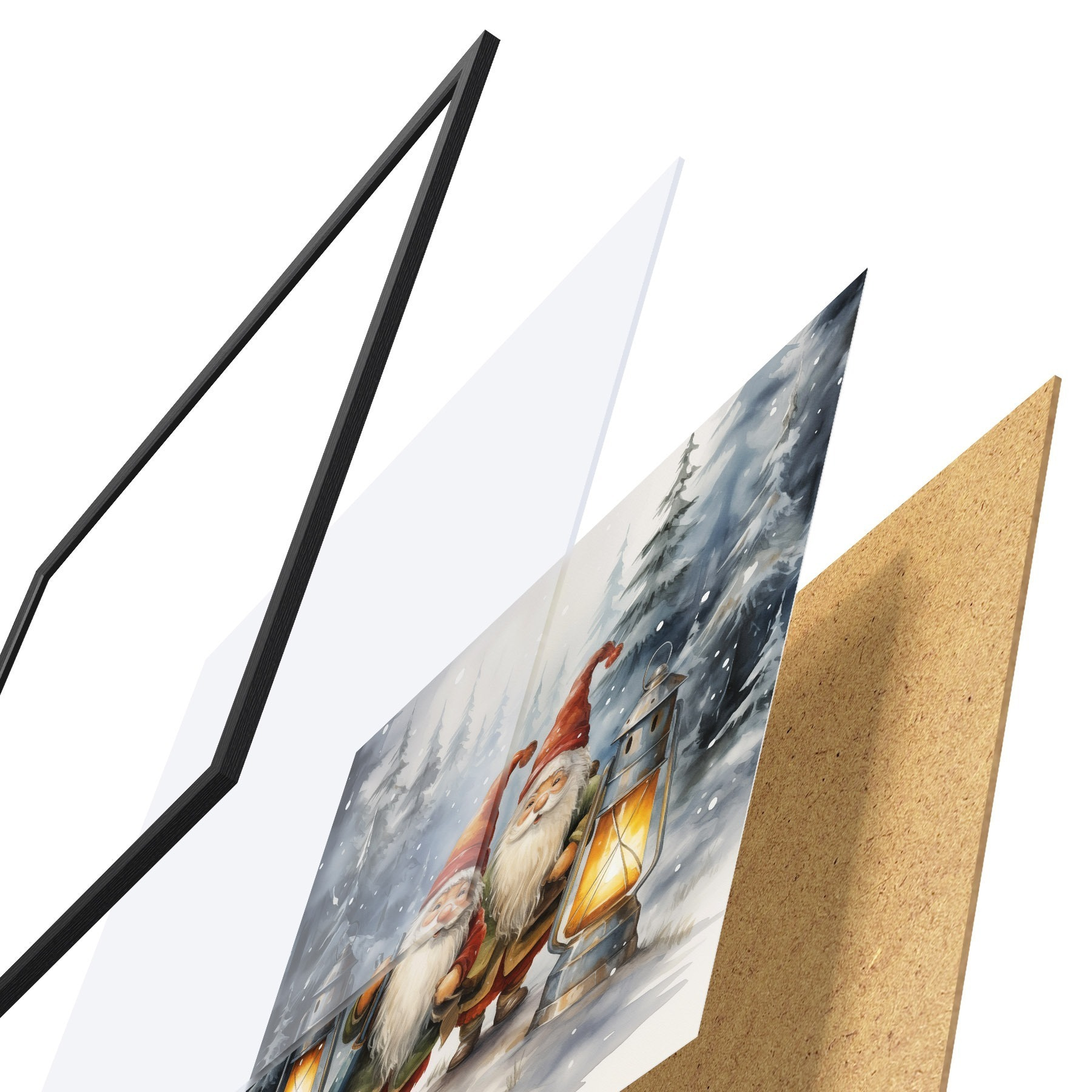 De poster bestaat uit een frame, plexiglas, geprinte afbeelding en spaanplaat achterkant. De poster kan meteen aan de muur worden gehangen dankzij de bevestigingen op de achterkant.