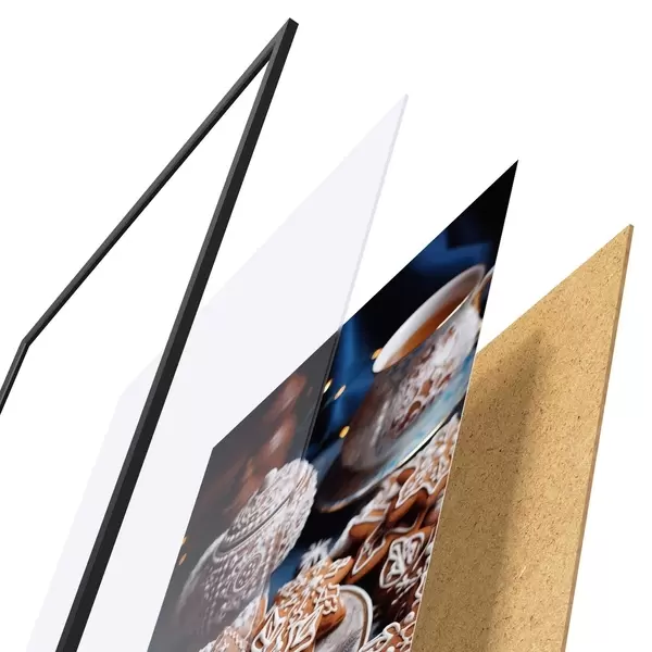 De poster bestaat uit een frame, plexiglas, geprinte afbeelding en spaanplaat achterkant. De poster kan meteen aan de muur worden gehangen dankzij de bevestigingen op de achterkant.