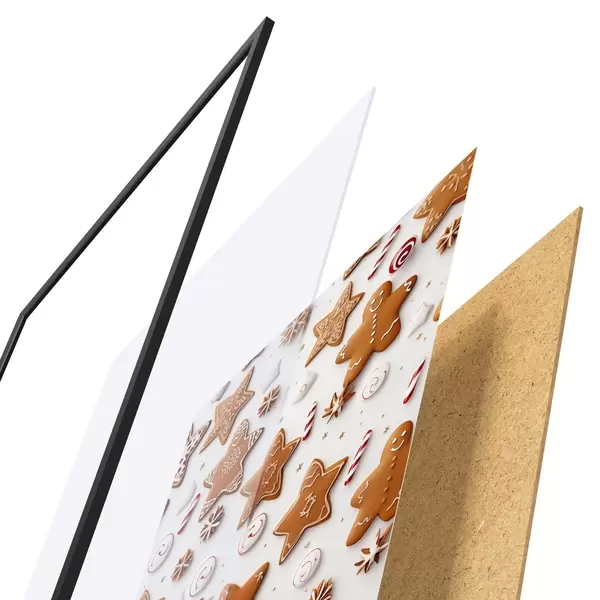 De poster bestaat uit een frame, plexiglas, geprinte afbeelding en spaanplaat achterkant. De poster kan meteen aan de muur worden gehangen dankzij de bevestigingen op de achterkant.