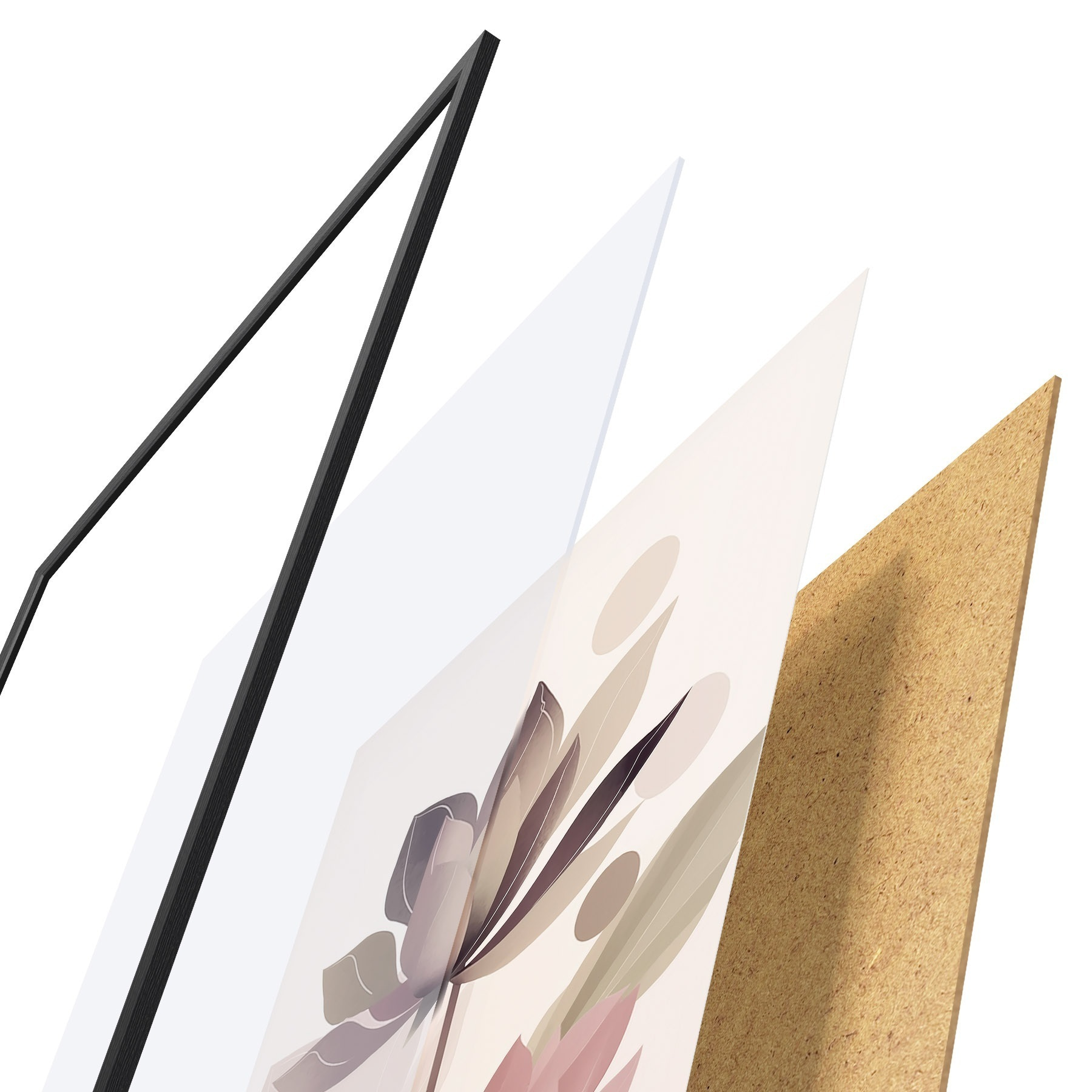 De poster bestaat uit een frame, plexiglas, geprinte afbeelding en spaanplaat achterkant. De poster kan meteen aan de muur worden gehangen dankzij de bevestigingen op de achterkant.