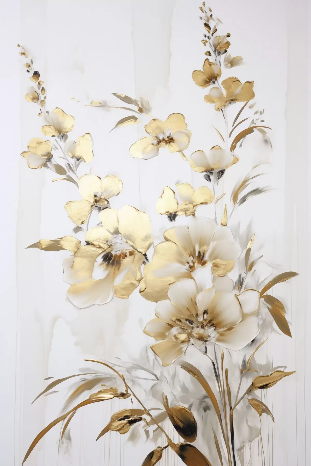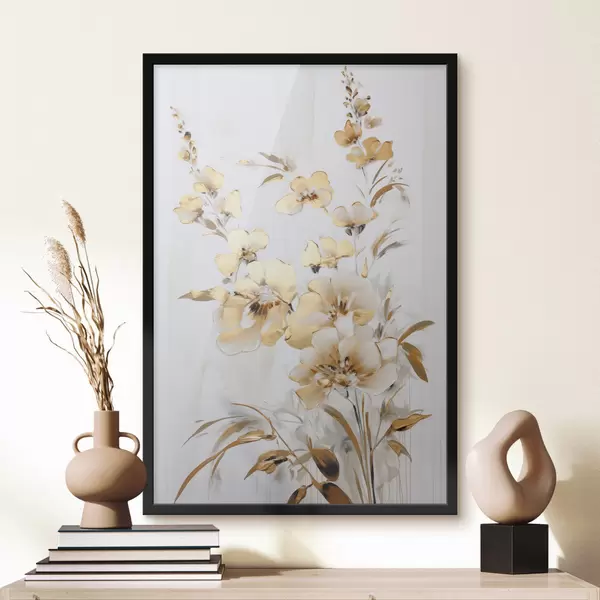 Poster Getextureerde gele bloemen en bladeren tegen een witte achtergrond, met delicate penseelstreken N° f47016