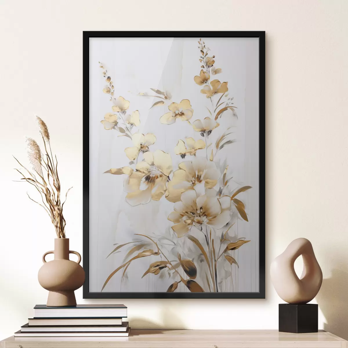 Poster Getextureerde gele bloemen en bladeren tegen een witte achtergrond, met delicate penseelstreken f47016
