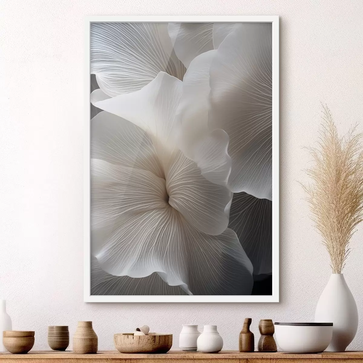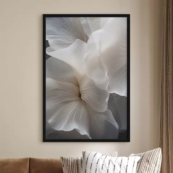 Poster Close-up van delicate abstracte witte bloemblaadjes met ingewikkelde lijnen en een wazige donkere achtergrond N° f47019