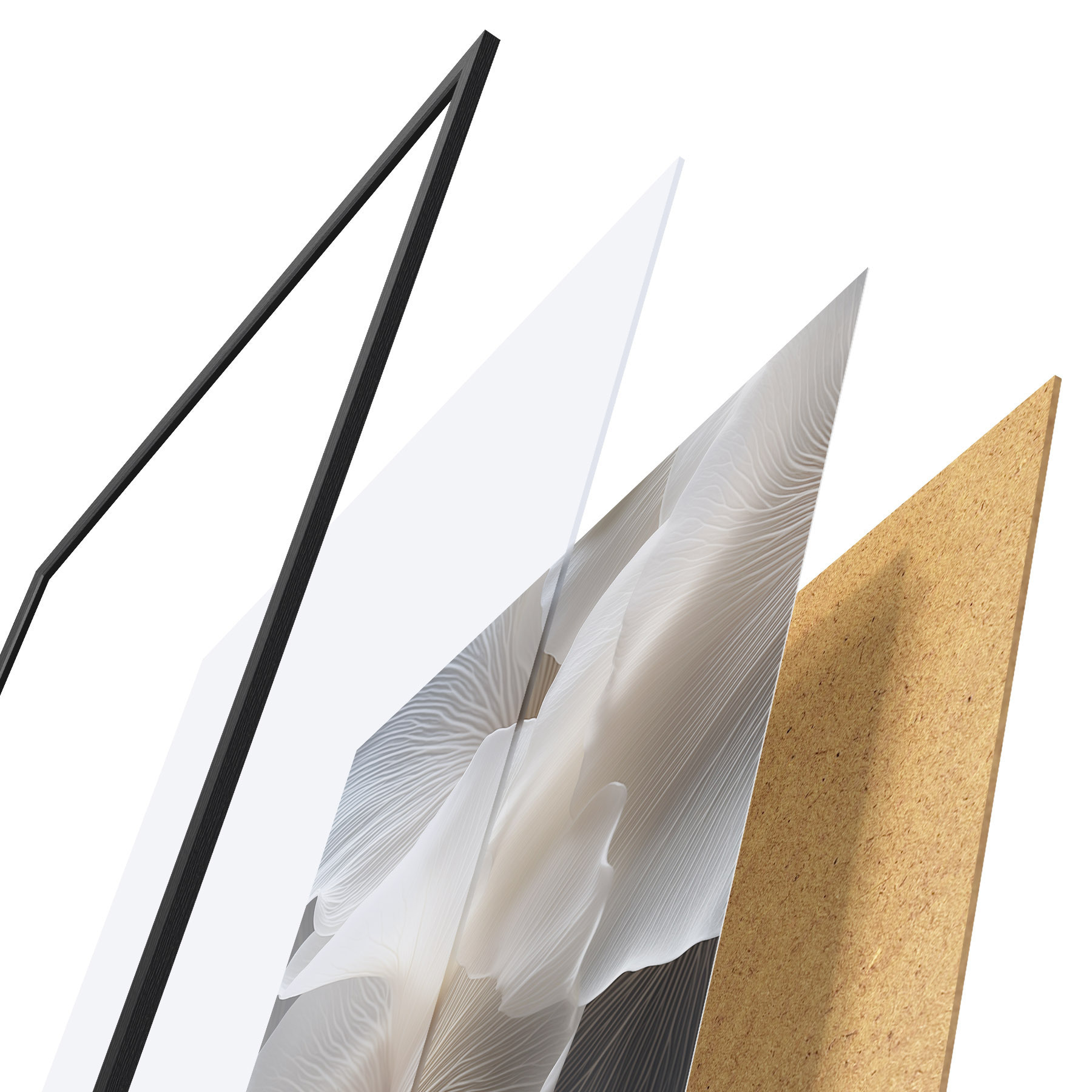 De poster bestaat uit een frame, plexiglas, geprinte afbeelding en spaanplaat achterkant. De poster kan meteen aan de muur worden gehangen dankzij de bevestigingen op de achterkant.