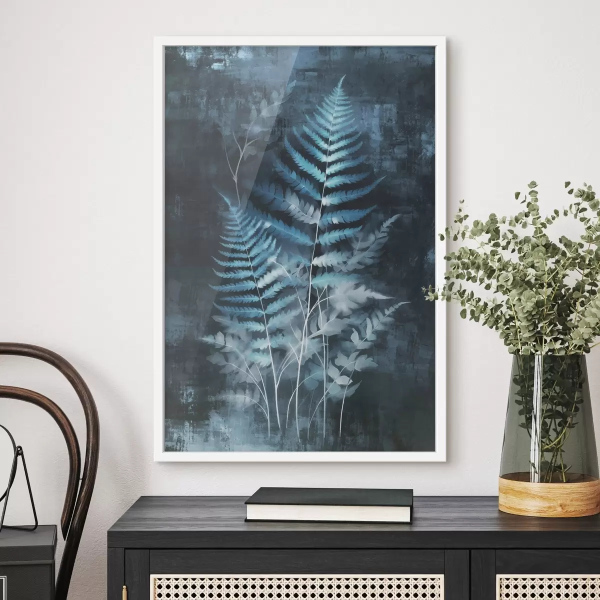 Poster Blauwe varens en planten tegen een donkere, gestructureerde achtergrond, met de nadruk op de ingewikkelde details, röntgeneffect N° f47026
