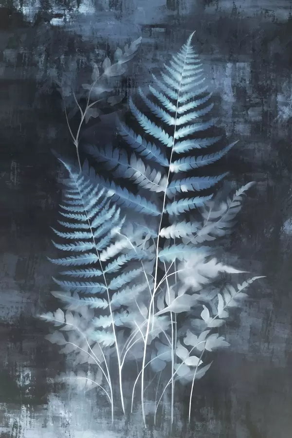 Poster Blauwe varens en planten tegen een donkere, gestructureerde achtergrond, met de nadruk op de ingewikkelde details, röntgeneffect N° f47026