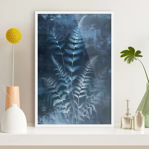 Poster Blauwe varens en planten tegen een donkere, gestructureerde achtergrond, met de nadruk op de ingewikkelde details, röntgeneffect N° f47027