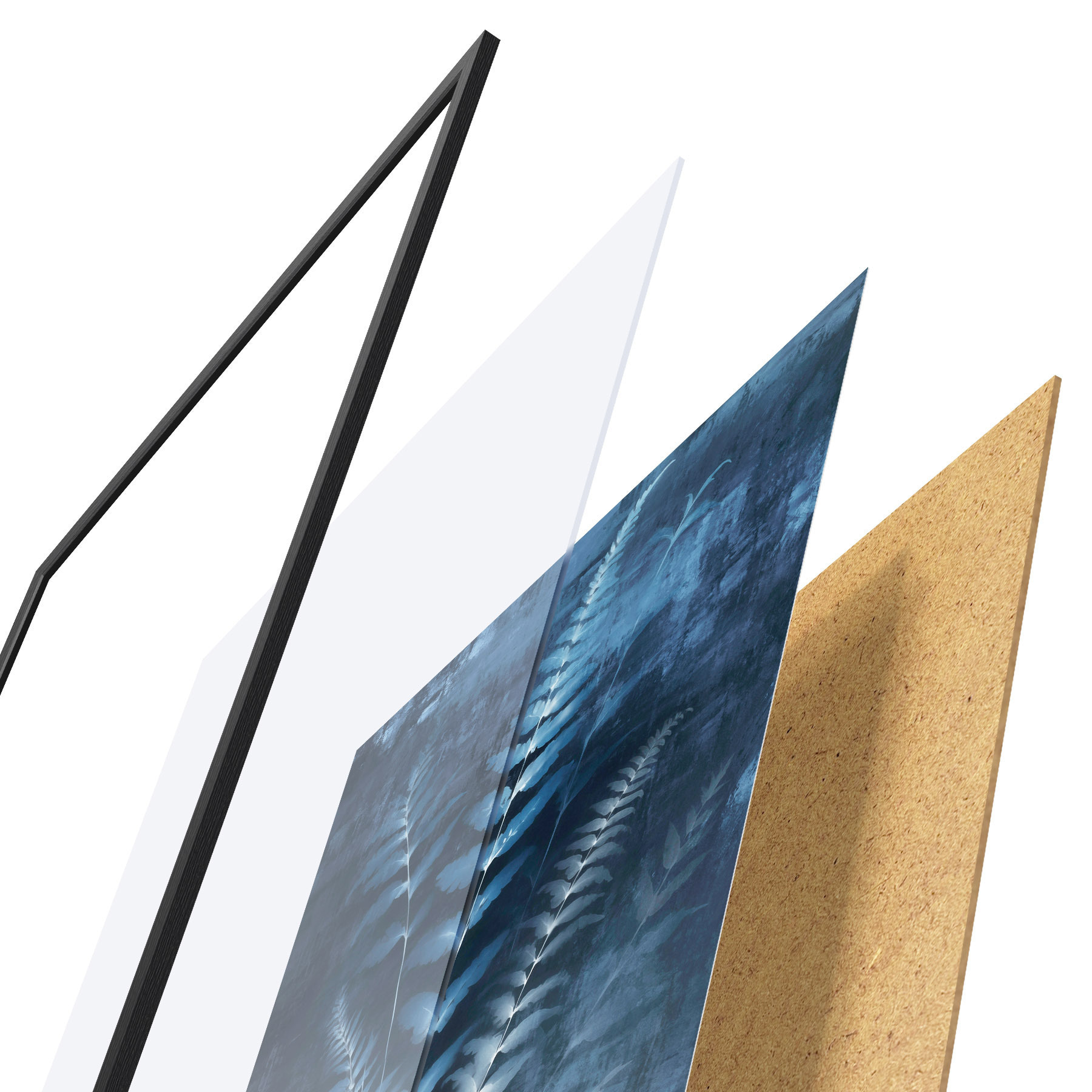 De poster bestaat uit een frame, plexiglas, geprinte afbeelding en spaanplaat achterkant. De poster kan meteen aan de muur worden gehangen dankzij de bevestigingen op de achterkant.