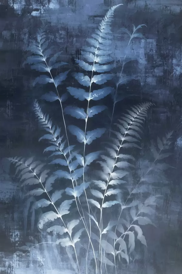 Poster Blauwe varens en planten tegen een donkere, gestructureerde achtergrond, met de nadruk op de ingewikkelde details, röntgeneffect N° f47027