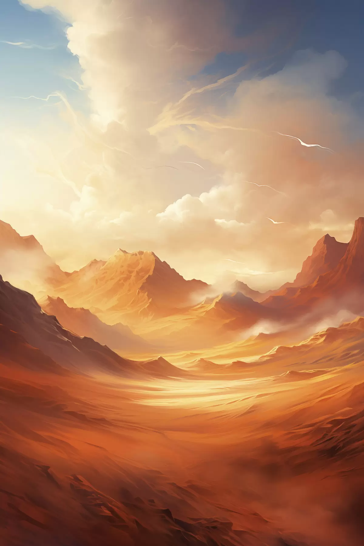 Poster Een uitgestrekt, oranje woestijnlandschap met torenhoge, rotsachtige bergen onder een wazige, zonovergoten hemel met dunne wolken. N° f47028