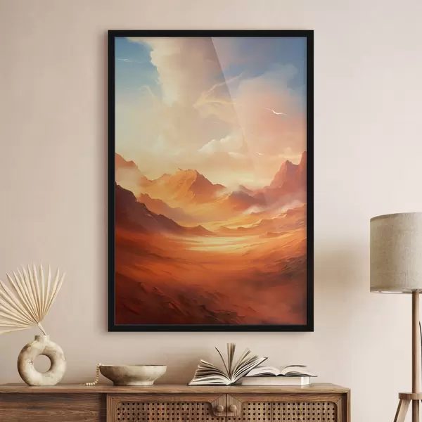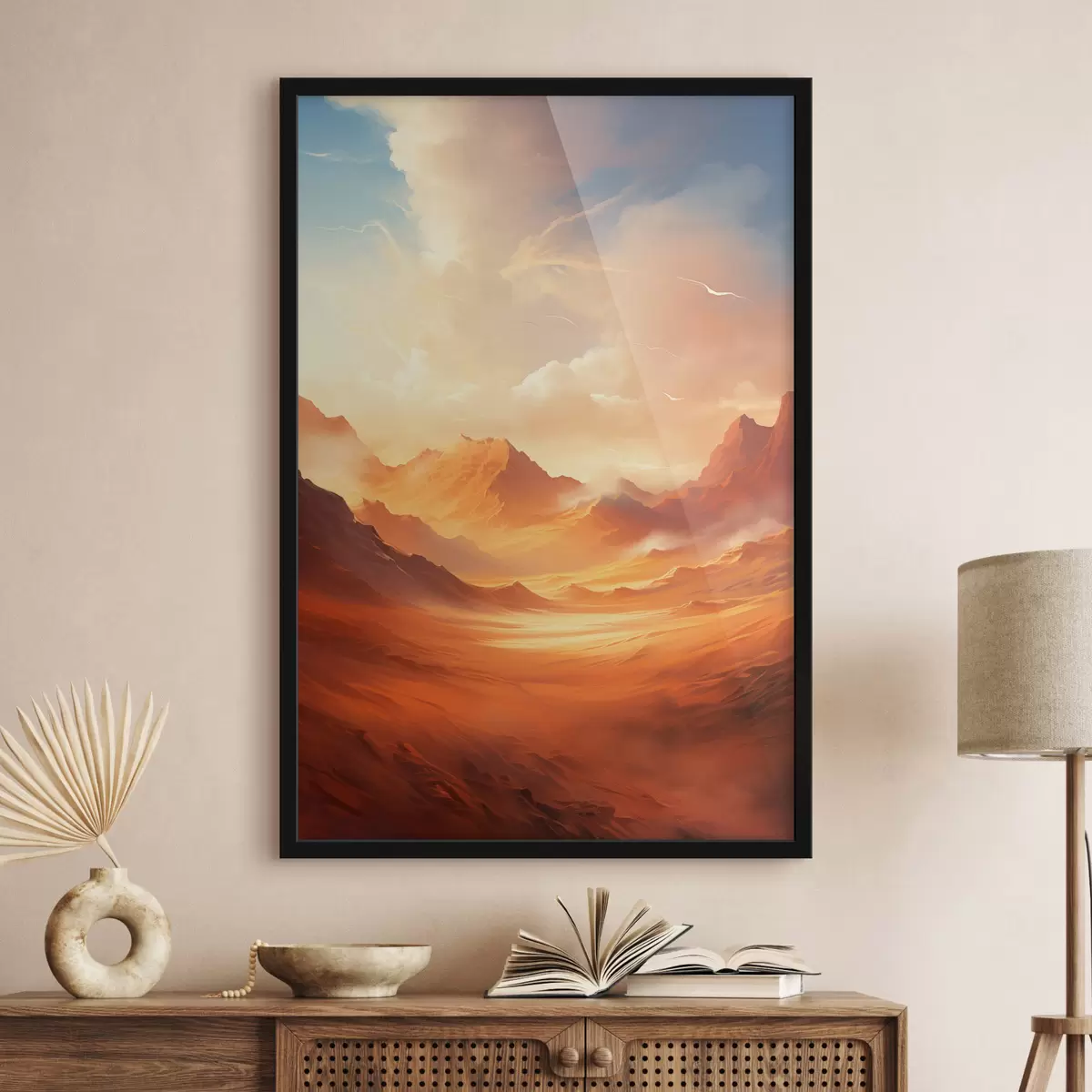 Poster Een uitgestrekt, oranje woestijnlandschap met torenhoge, rotsachtige bergen onder een wazige, zonovergoten hemel met dunne wolken. f47028