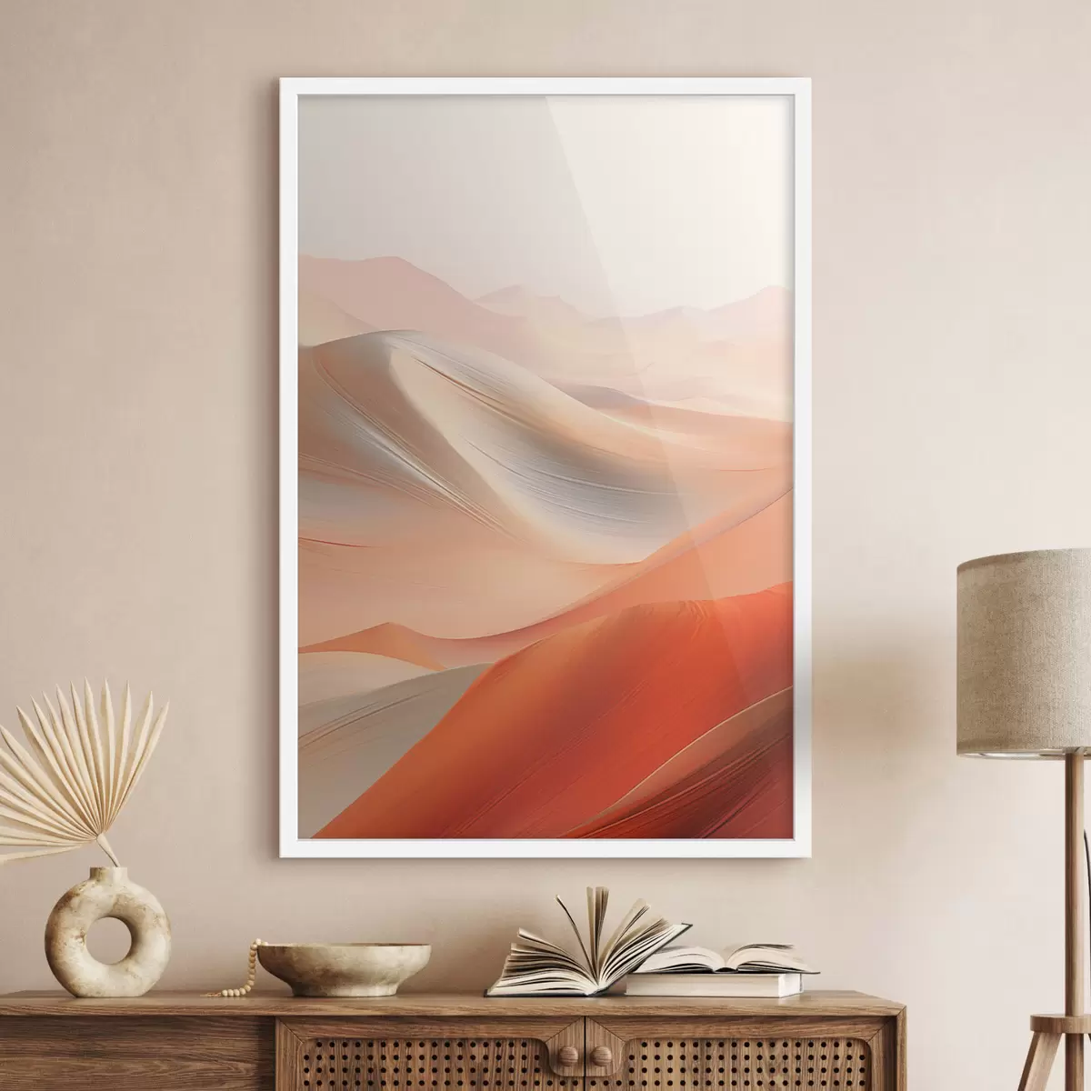 Poster Abstract woestijnlandschap met vloeiende zandduinen in warme oranje en witte tinten f47030