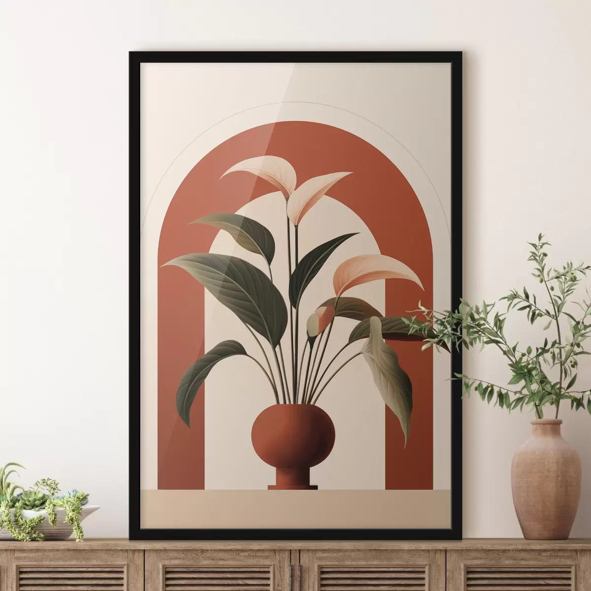 Poster Abstracte potplant met grote groene en beige bladeren voor een crèmekleurige boog met een terracotta accent N° f47032