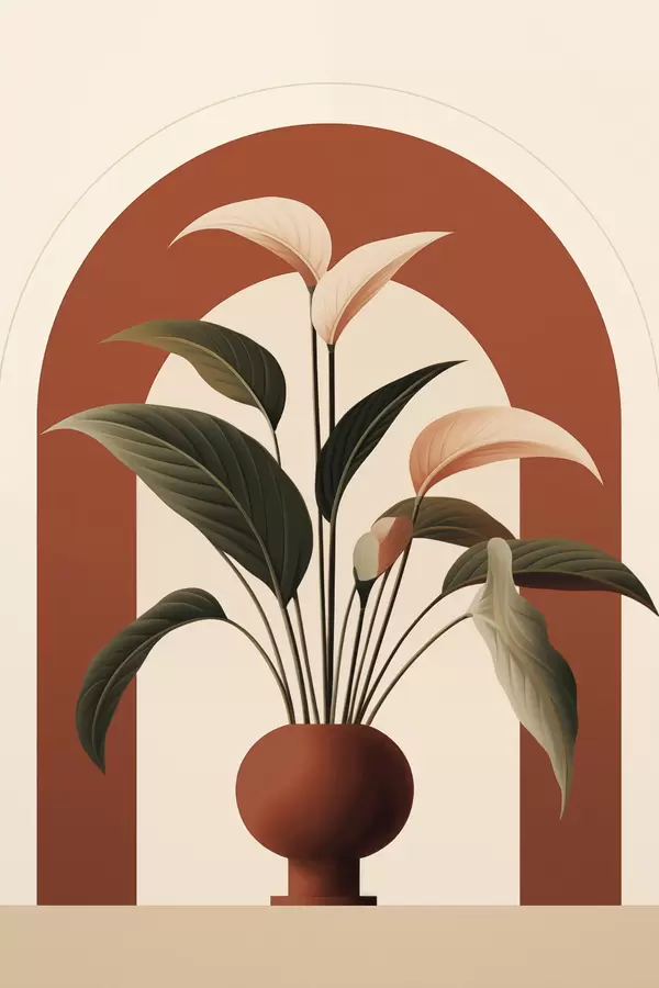 Poster Abstracte potplant met grote groene en beige bladeren voor een crèmekleurige boog met een terracotta accent N° f47032