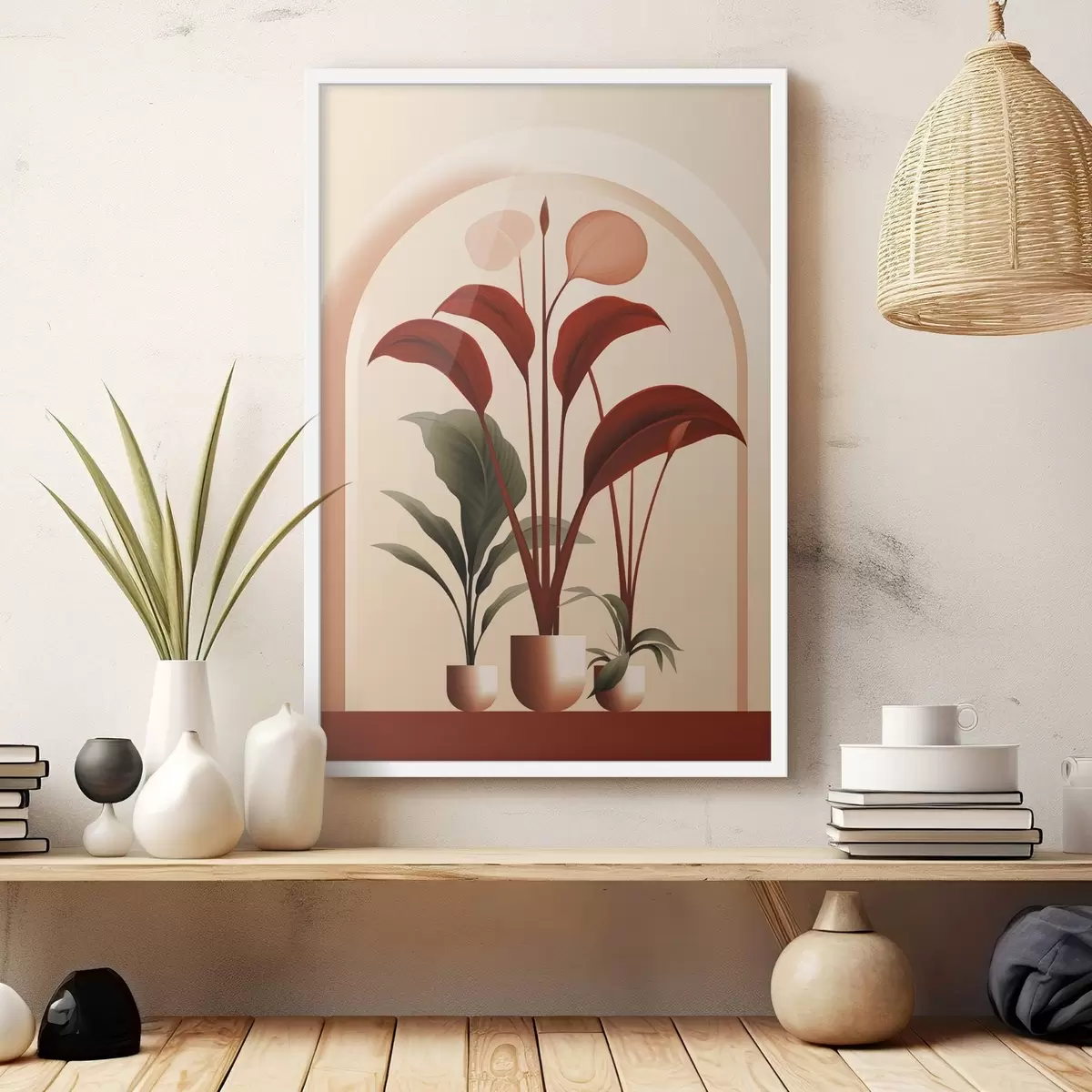Poster Abstracte potplanten met grote groene en rode bladeren voor een crèmekleurige boog N° f47033