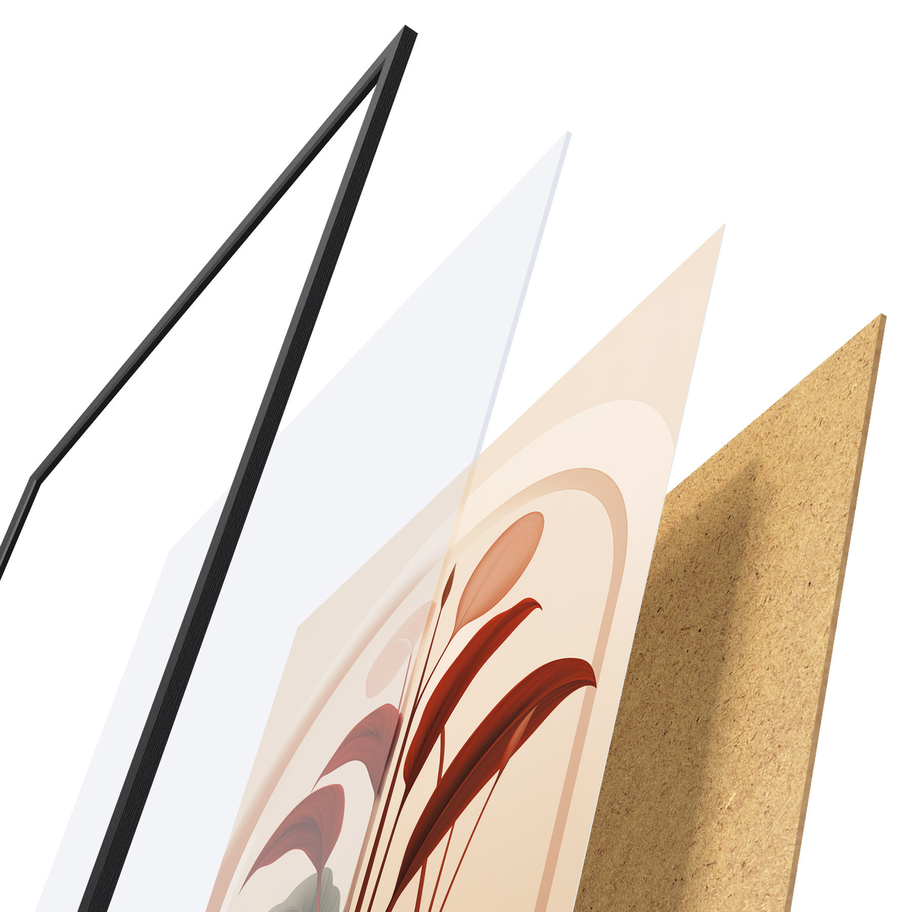 De poster bestaat uit een frame, plexiglas, geprinte afbeelding en spaanplaat achterkant. De poster kan meteen aan de muur worden gehangen dankzij de bevestigingen op de achterkant.