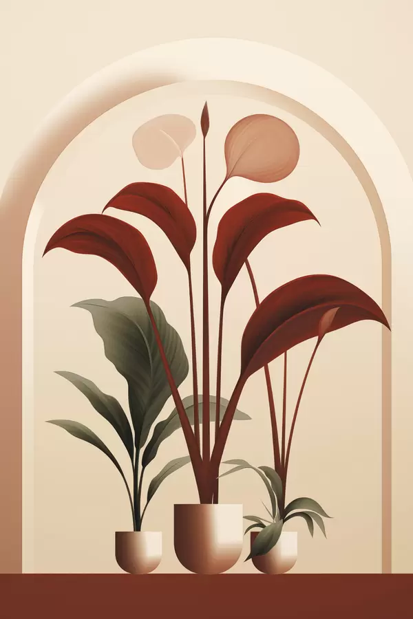 Poster Abstracte potplanten met grote groene en rode bladeren voor een crèmekleurige boog N° f47033