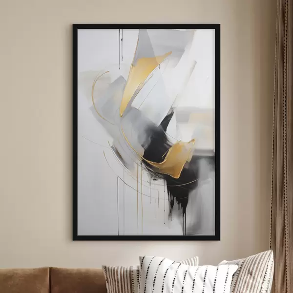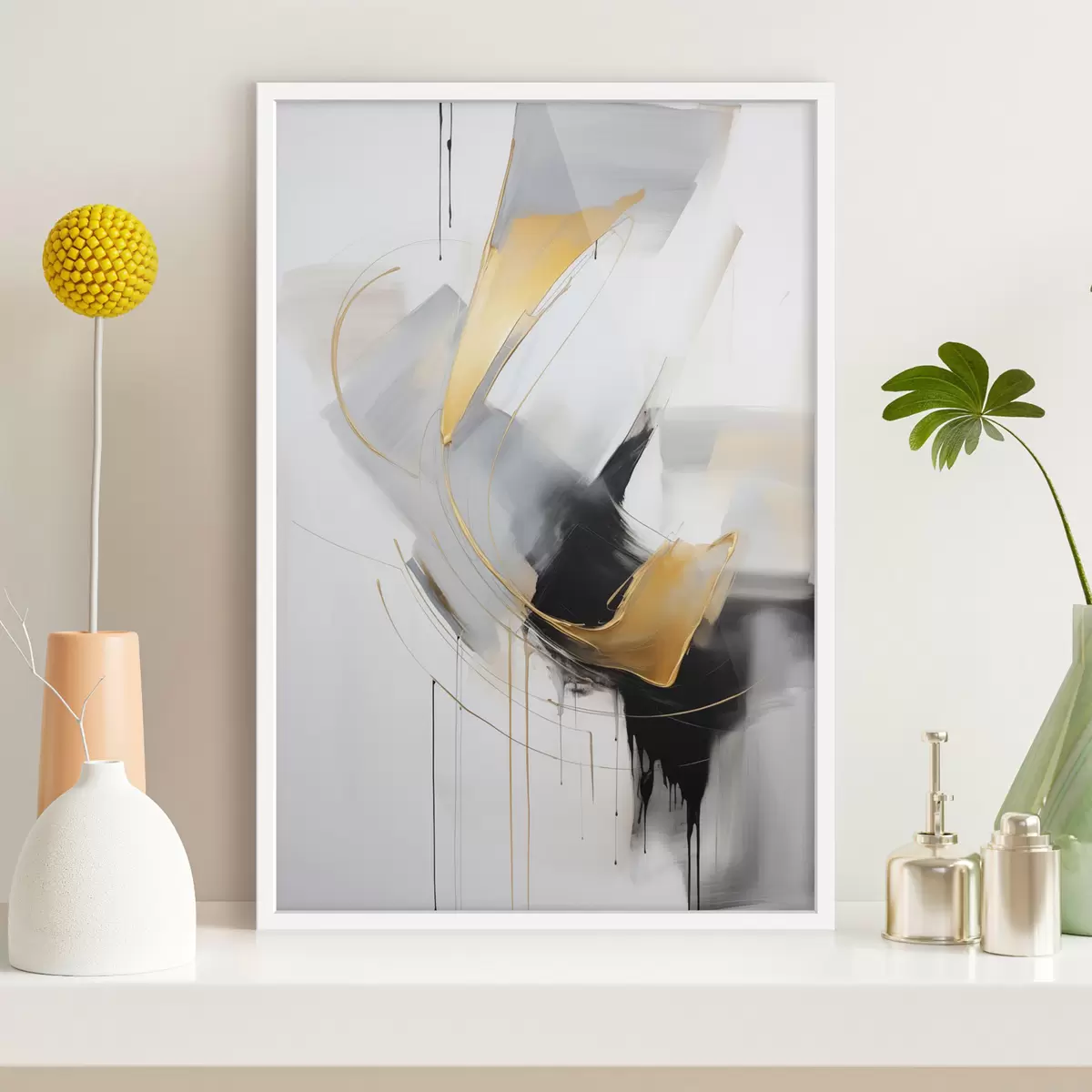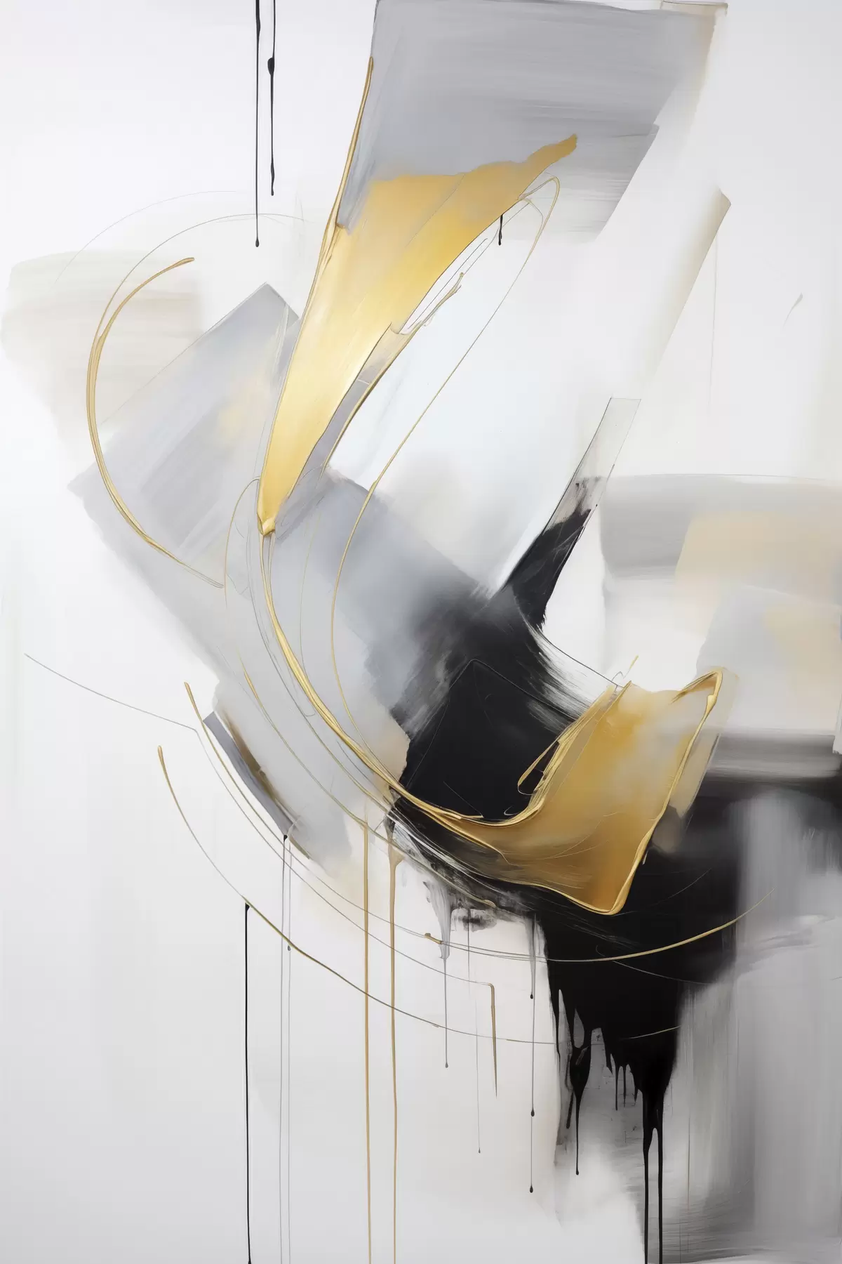 Poster Abstract schilderij met gele en zwart-witte penseelstreken, dynamische lijnen N° f47034