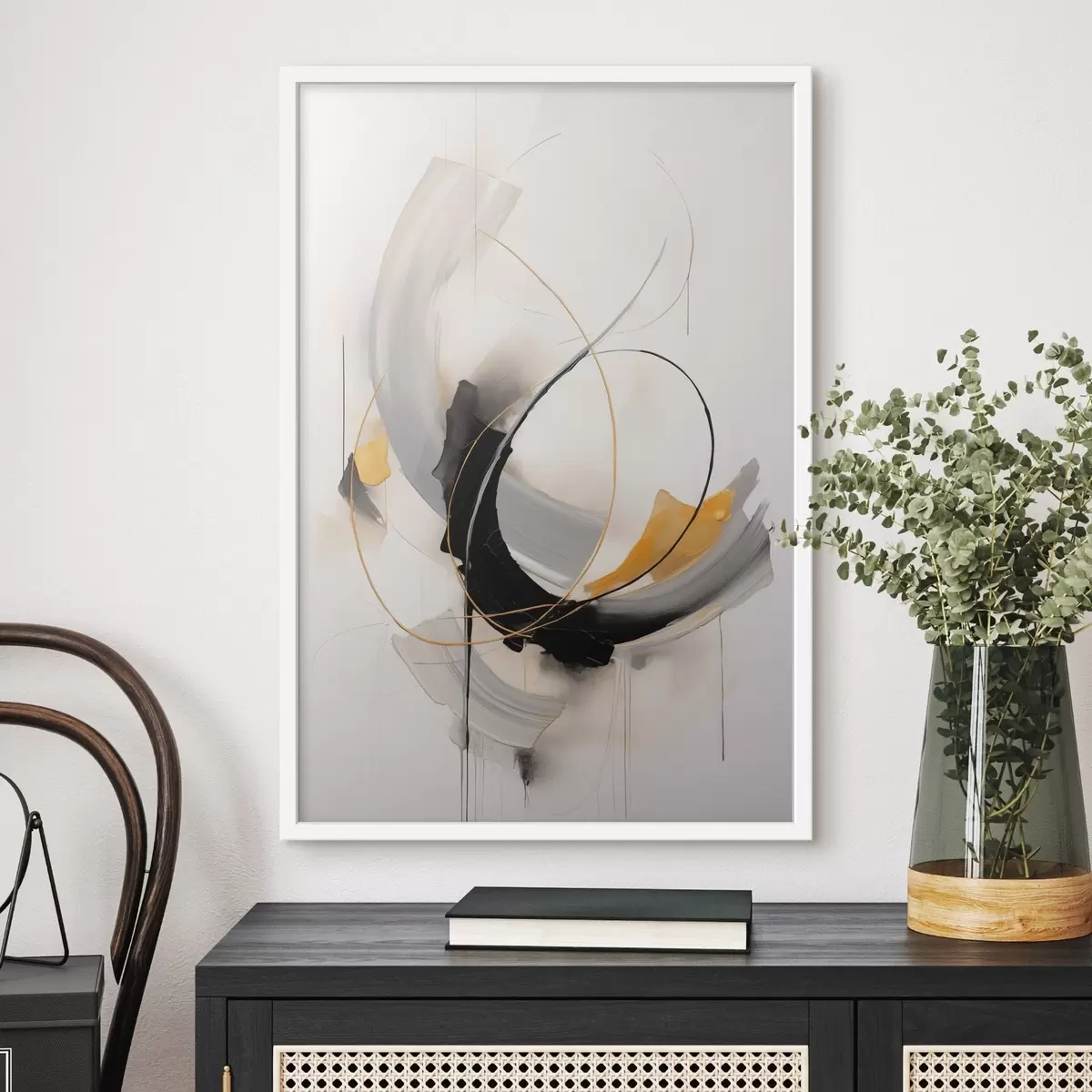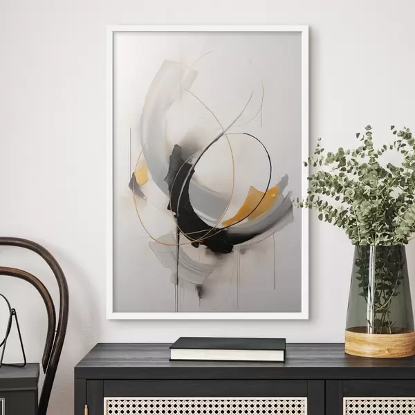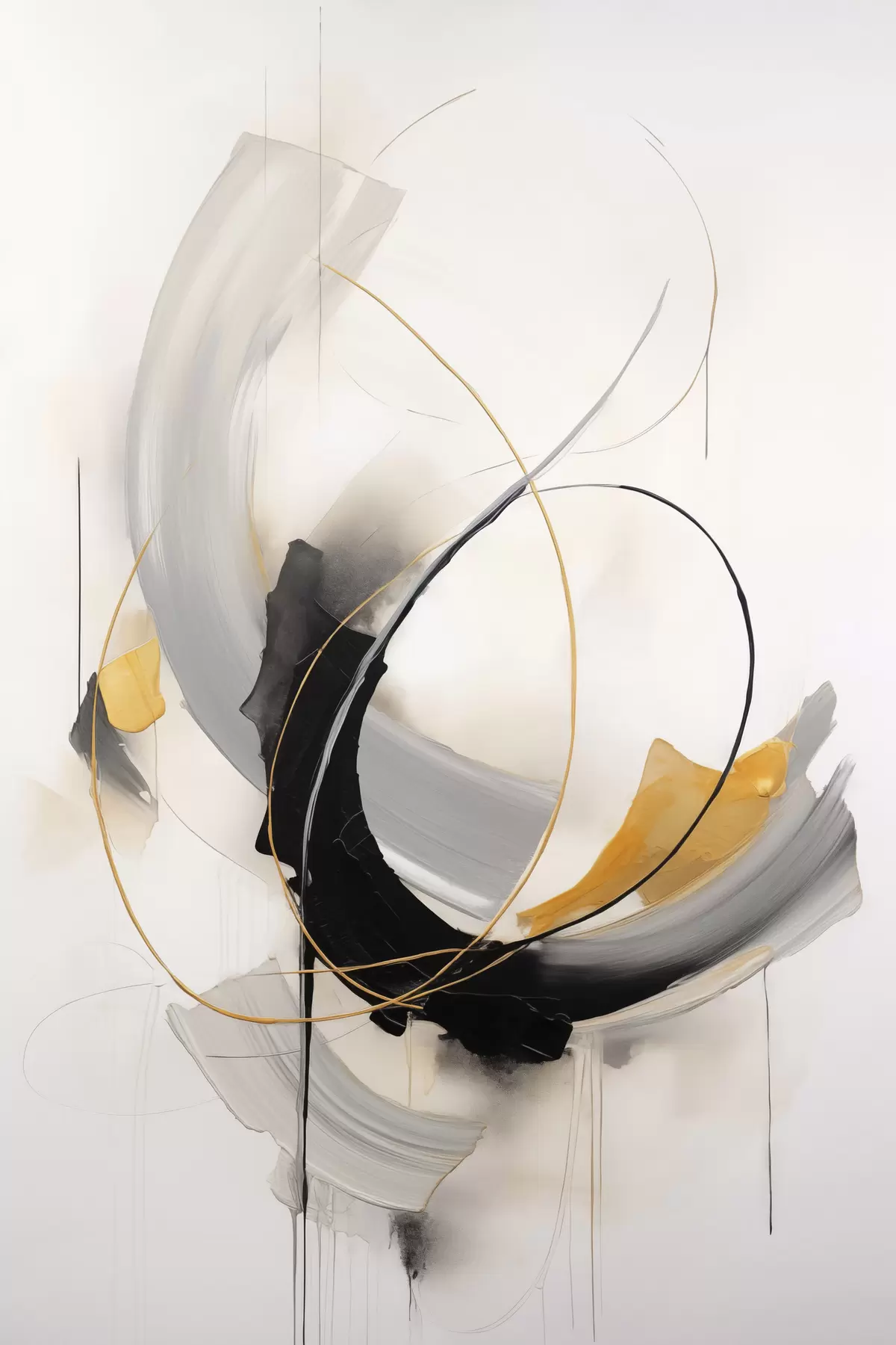 Poster Abstract schilderij met gele en zwart-witte penseelstreken, dynamische lijnen N° f47035