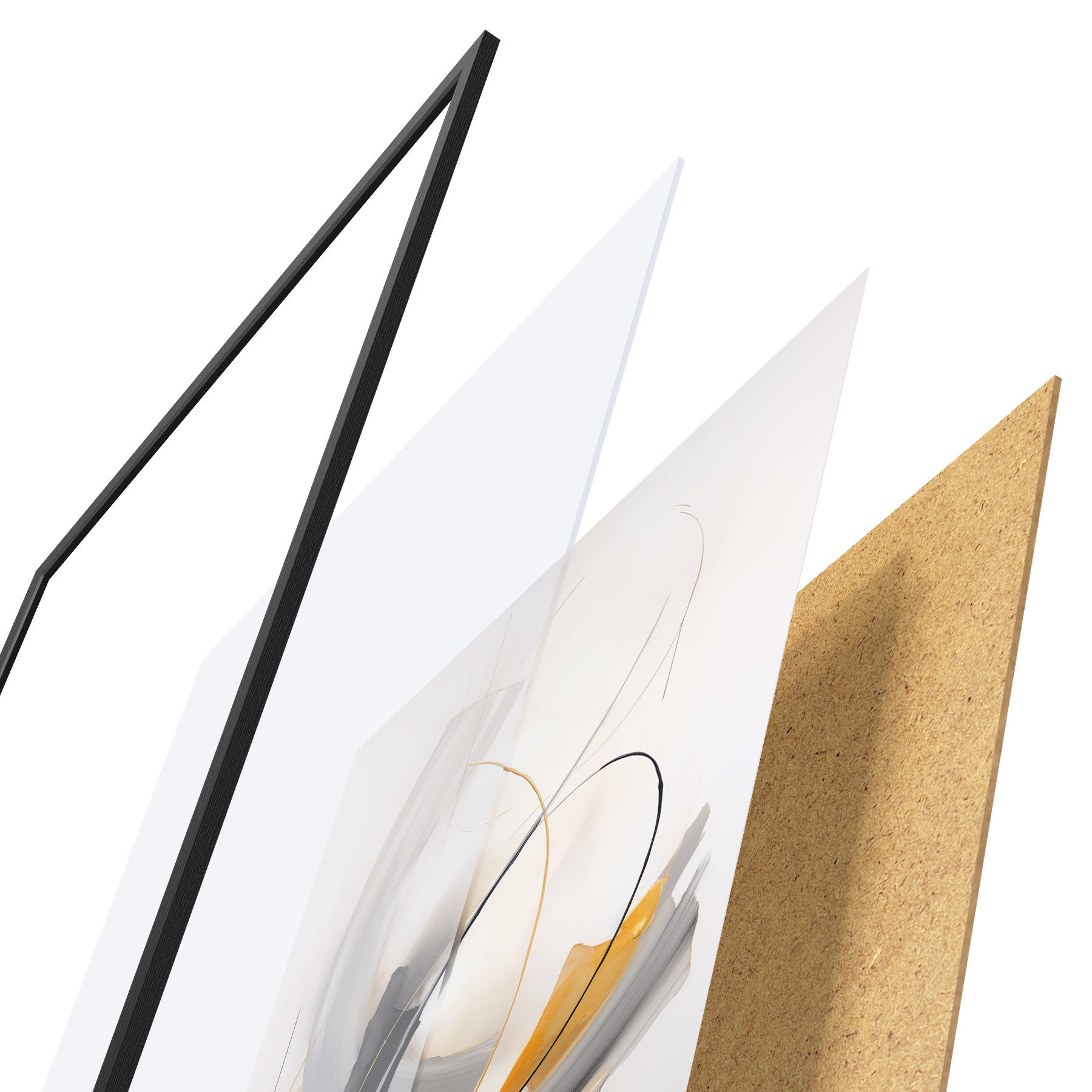 De poster bestaat uit een frame, plexiglas, geprinte afbeelding en spaanplaat achterkant. De poster kan meteen aan de muur worden gehangen dankzij de bevestigingen op de achterkant.